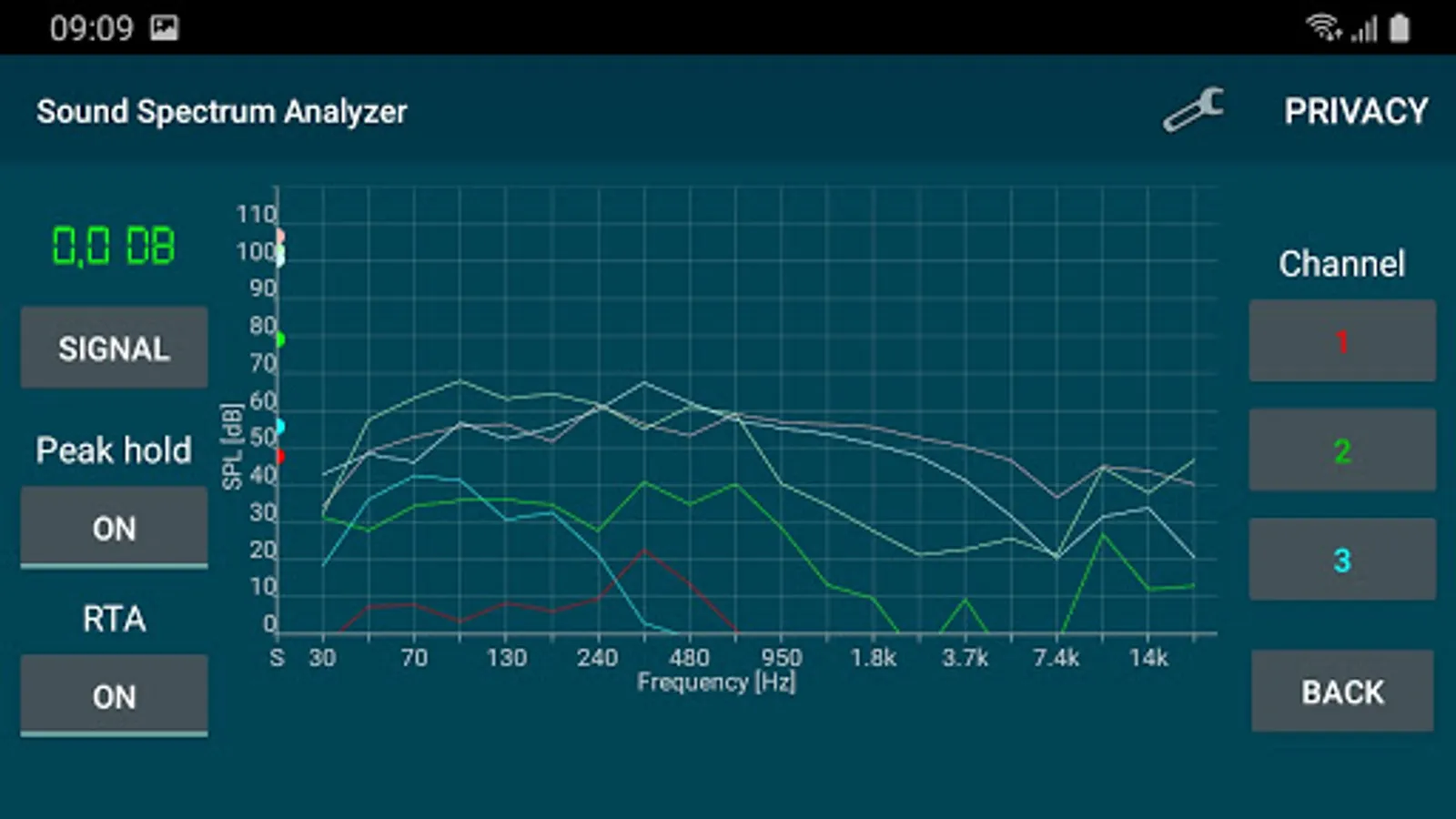 The analyzer is very easy to use and offers a lot of useful features: high RTA refreshing rate and frequency spectrum resolution, adjustable sound noise level (SPL) amplitude scale (up to 150 decibels), RTA peak hold function, flat reference line, local peak frequency...
