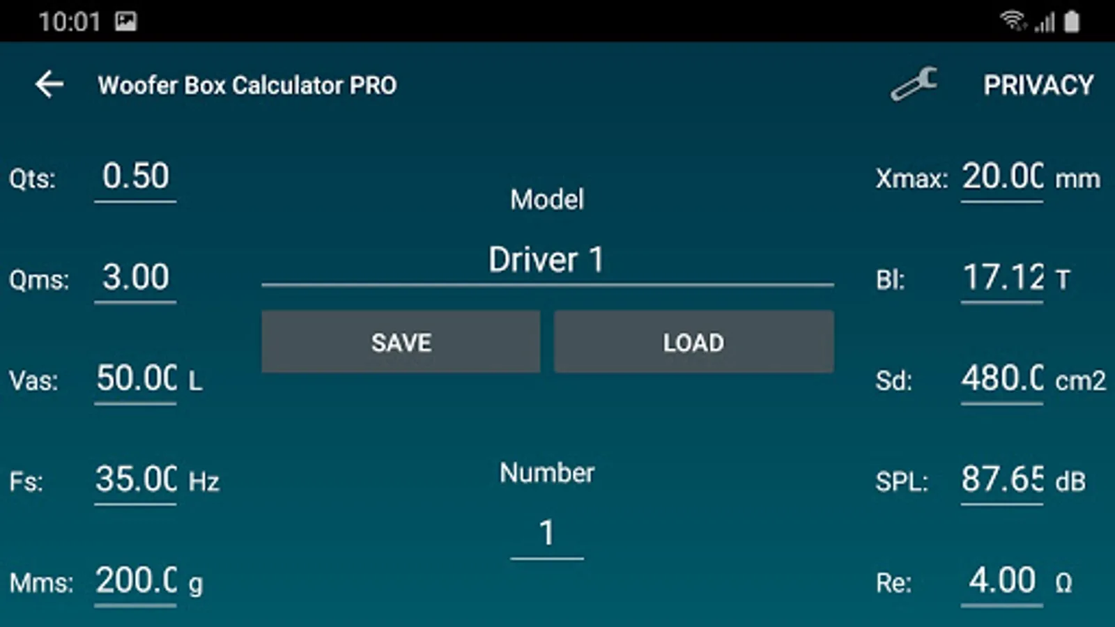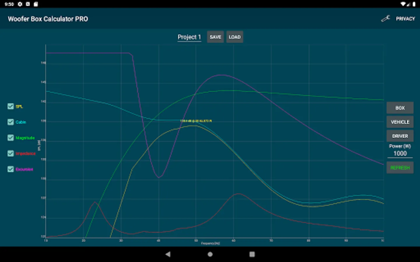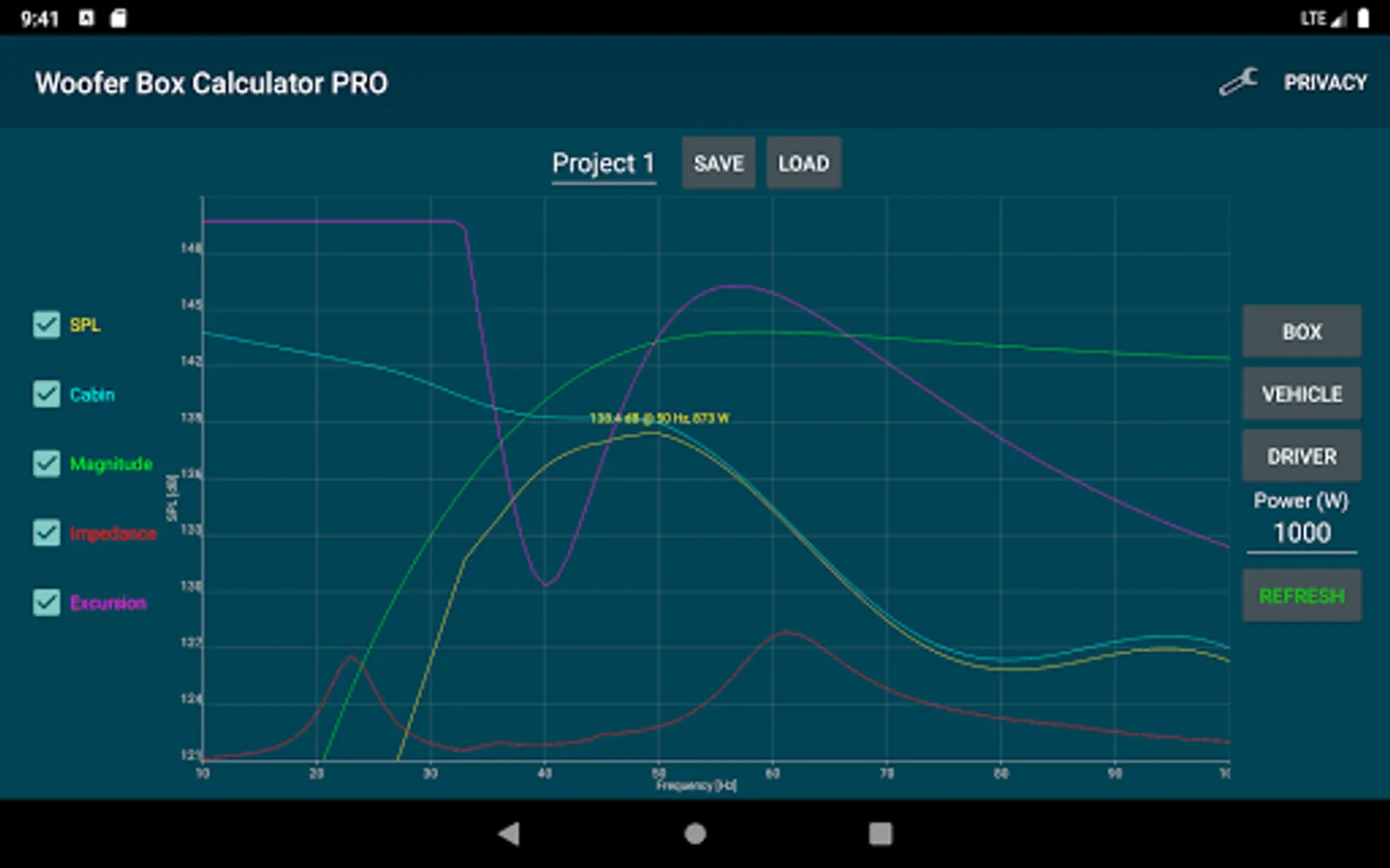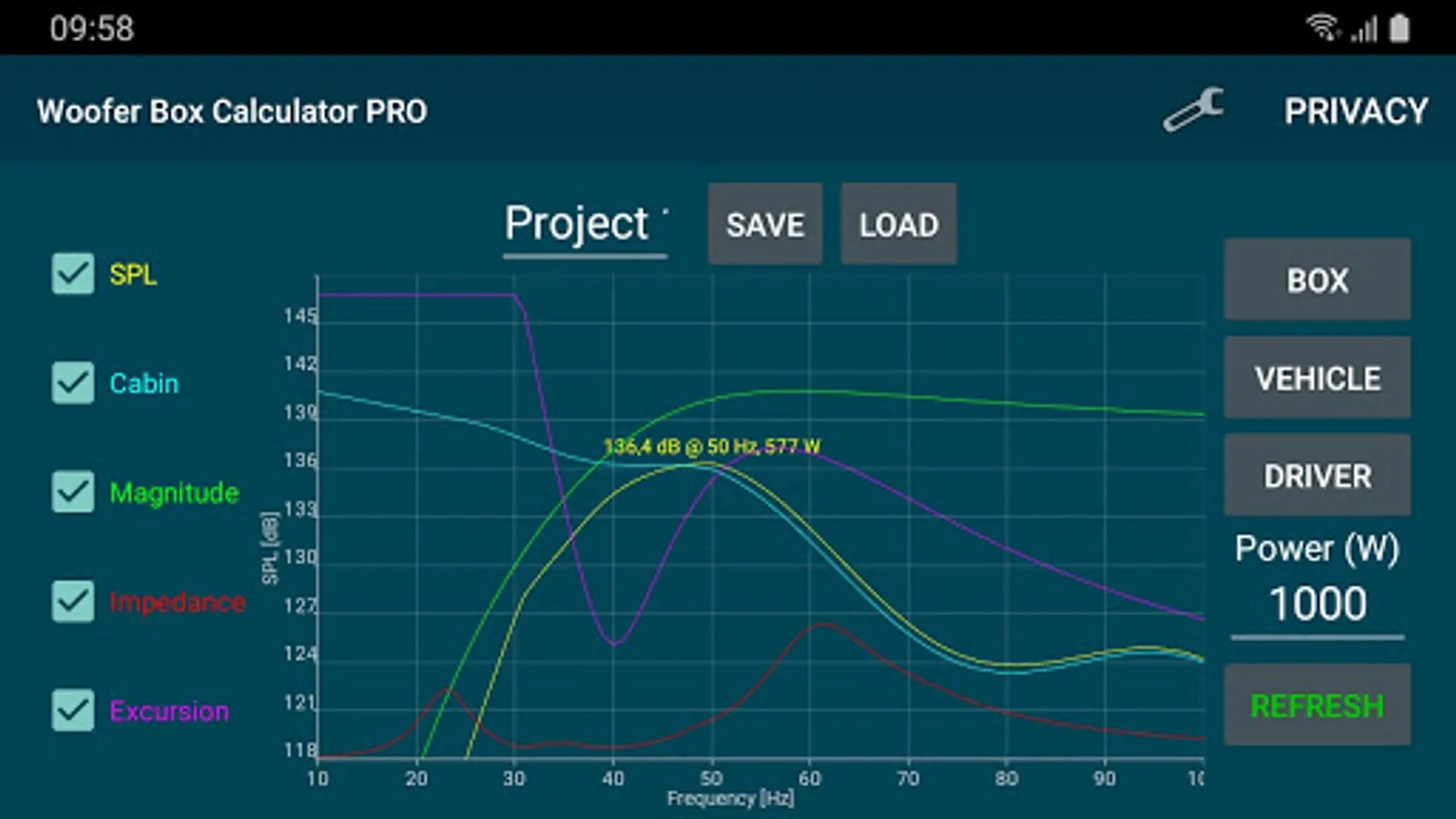 Design projects can easily be saved and loaded. Enclosures, speakers and Vehicles can also be saved and loaded separately. Units an constraints can be changed under settings.