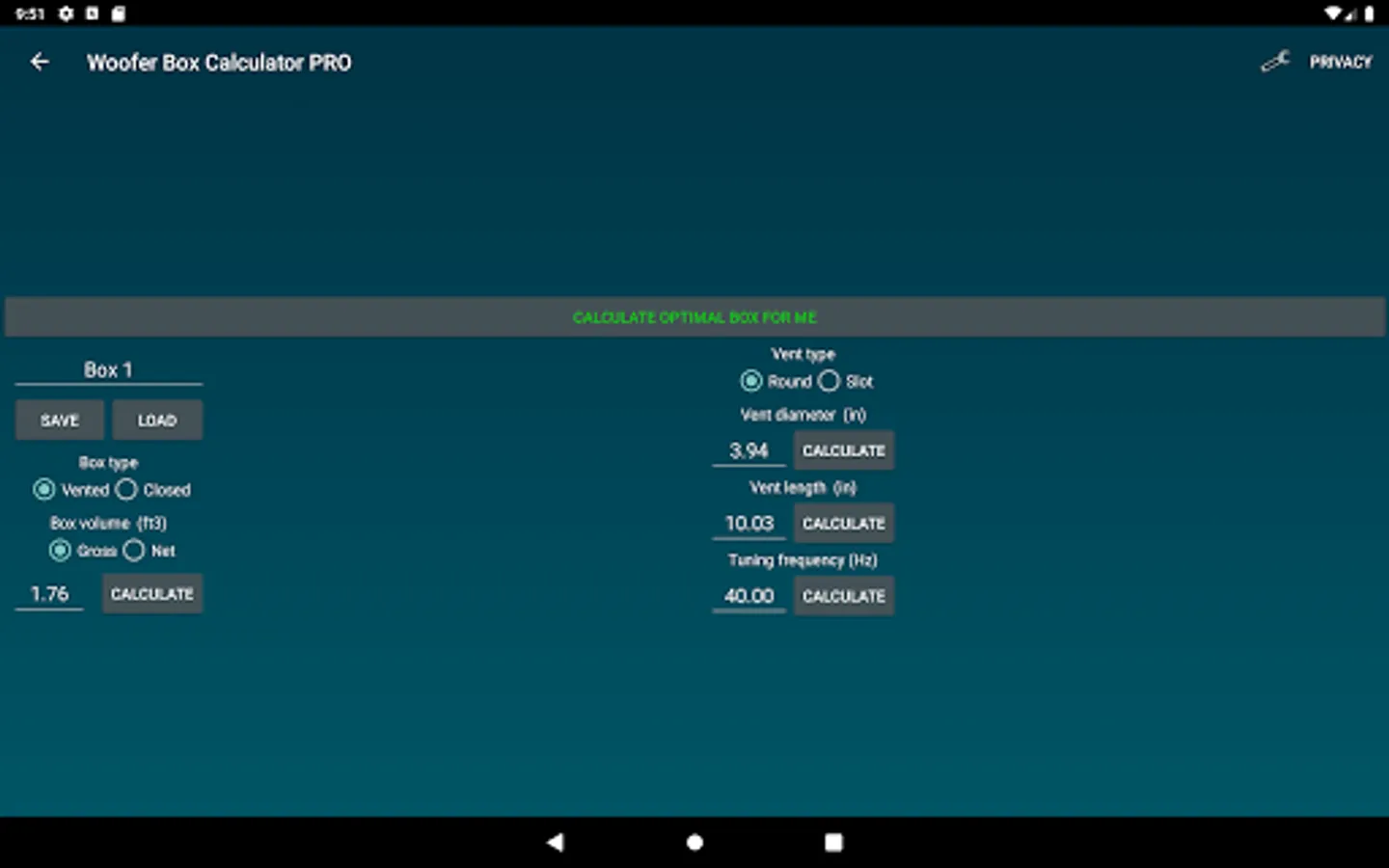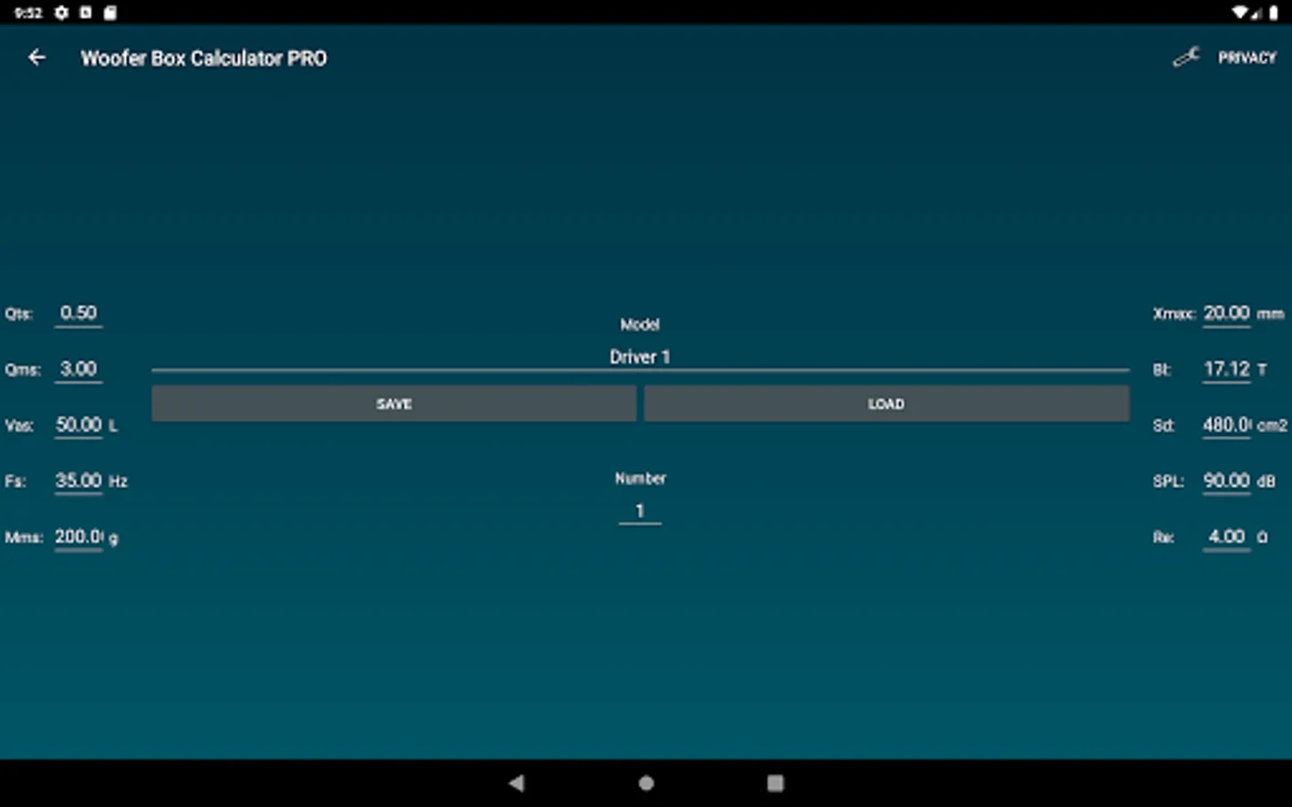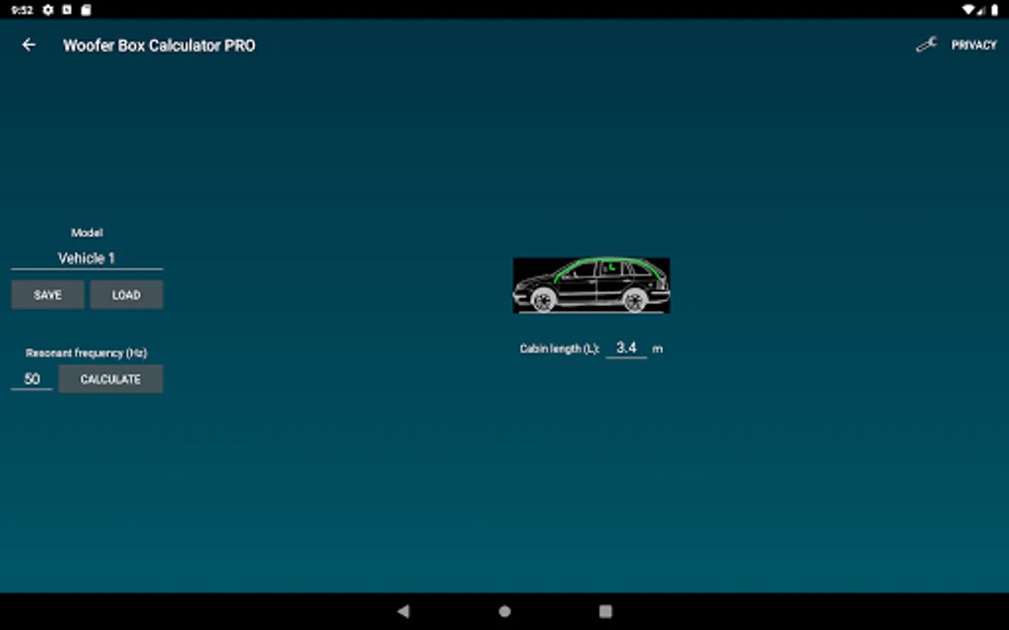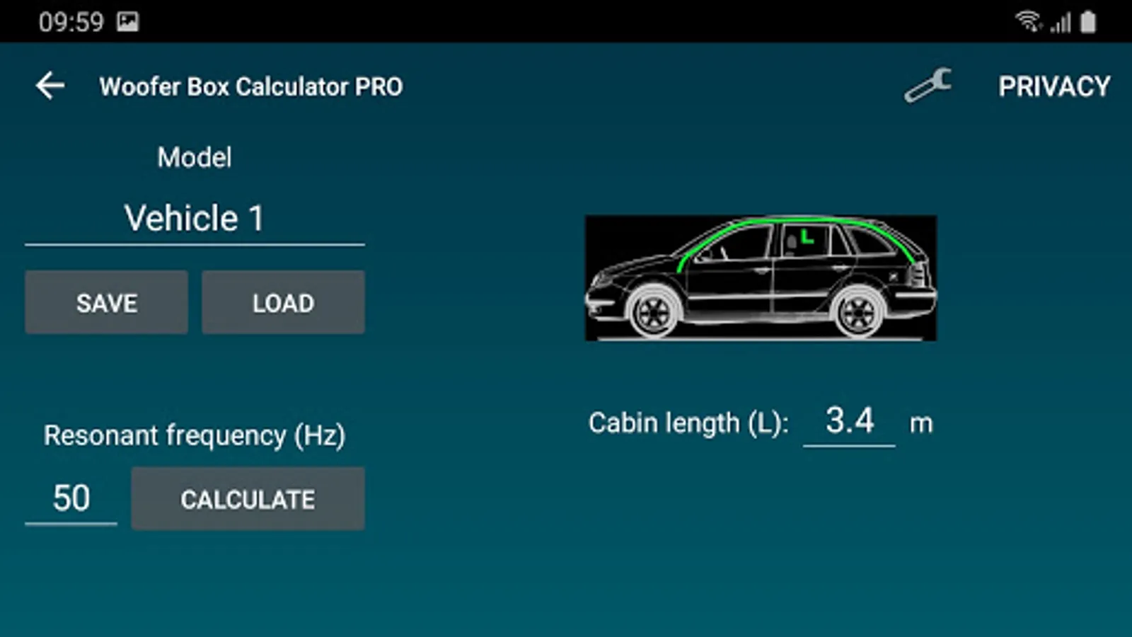 Design projects can easily be saved and loaded. Enclosures, speakers and Vehicles can also be saved and loaded separately. Units an constraints can be changed under settings.