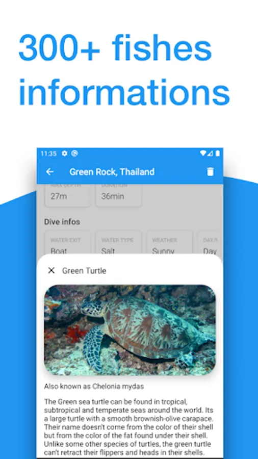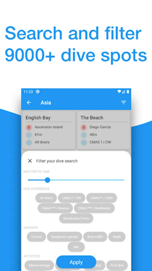 Diverr makes you able to explore dive spots all around the world, with advanced filtering. Also mark all the marine life you saw during your dives.