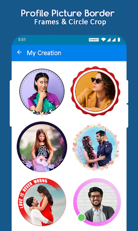 • Tap-Tap-Tap :- You just need to tap a few times on your screen to give your DP an attractive look. Profile Picture Border Frames is packed with loads of beautiful DP frames to beautify your profile picture. Allow you to create your image in circle shape and set as your profile picture or display picture.