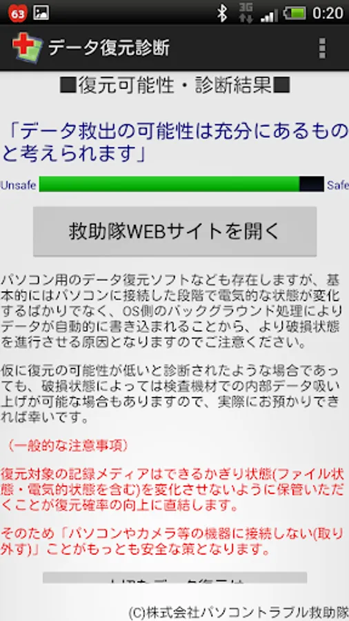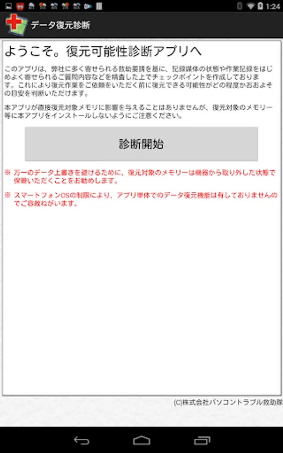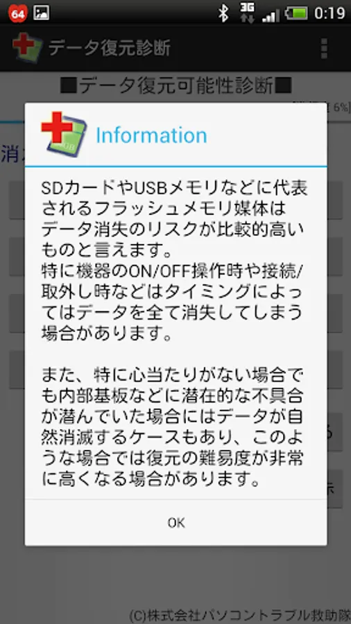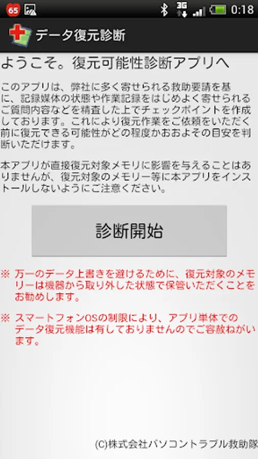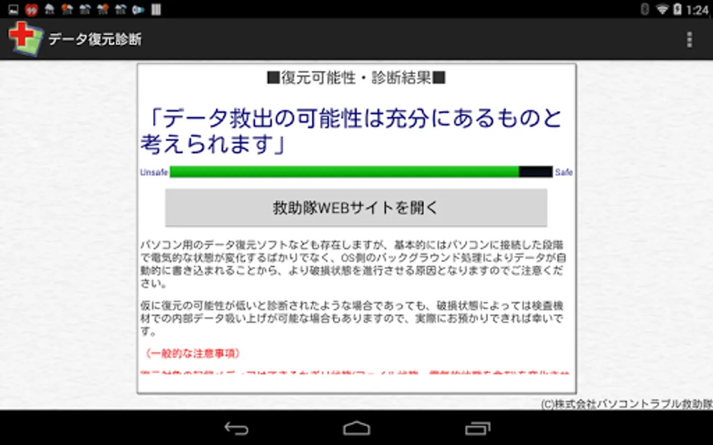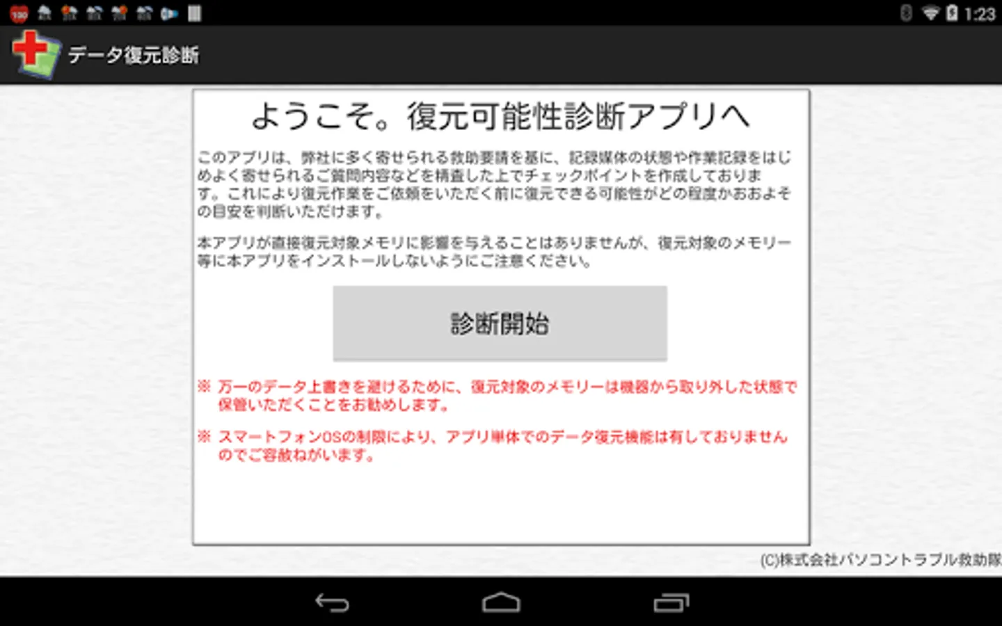 ・Androidの制限により当アプリ単体での削除データを復元する機能はありません。利用状況ごとに復元できる可能性を診断するためのアプリです。復元ソフトを利用して削除データをご自身で復元される場合には相当のリスクが伴いますのでご注意ください。