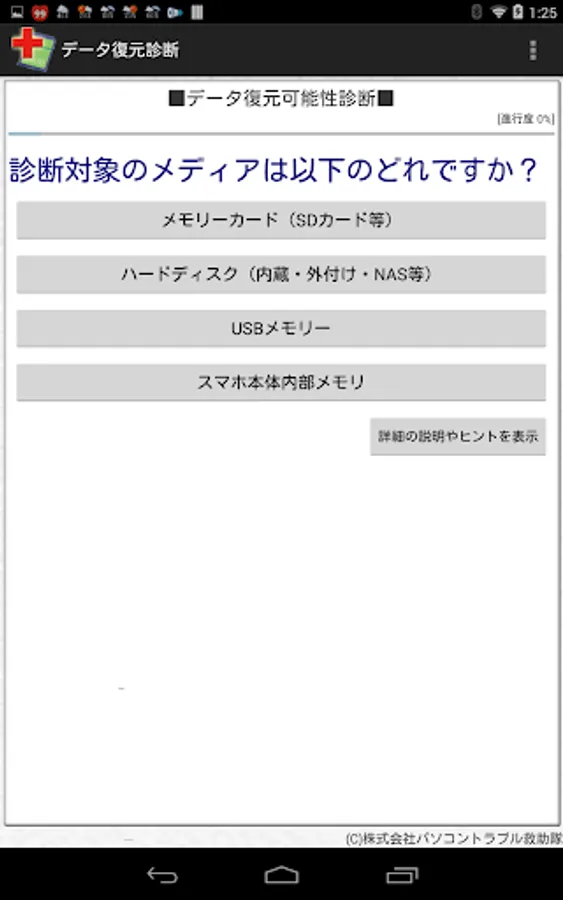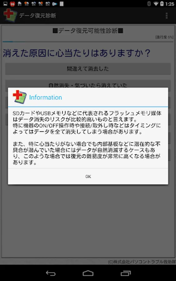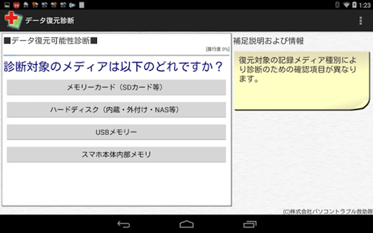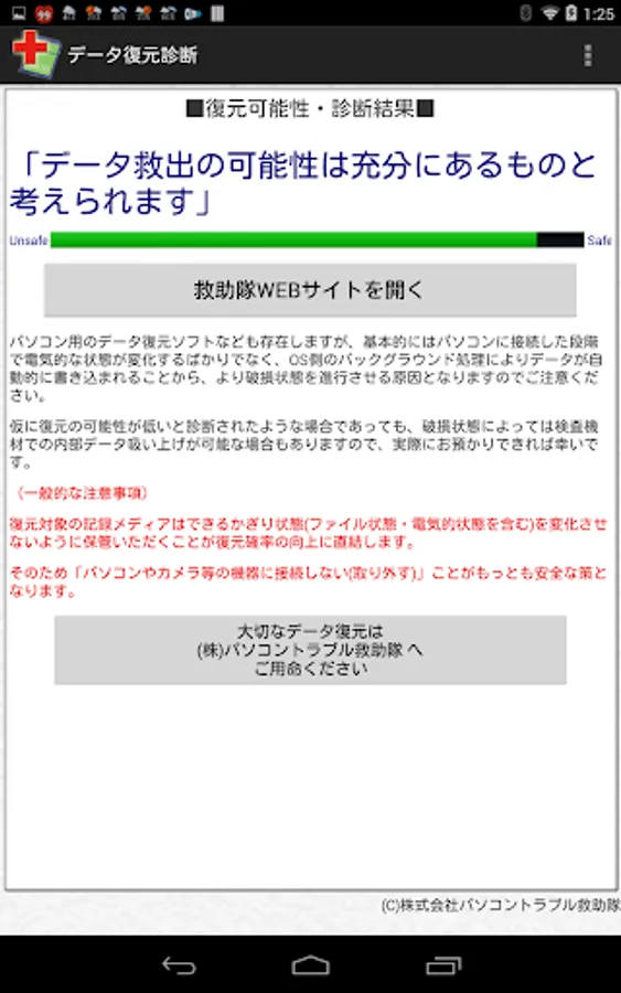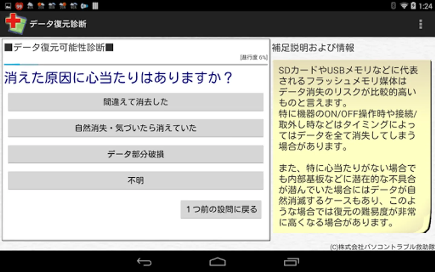 ・Androidの制限により当アプリ単体での削除データを復元する機能はありません。利用状況ごとに復元できる可能性を診断するためのアプリです。復元ソフトを利用して削除データをご自身で復元される場合には相当のリスクが伴いますのでご注意ください。