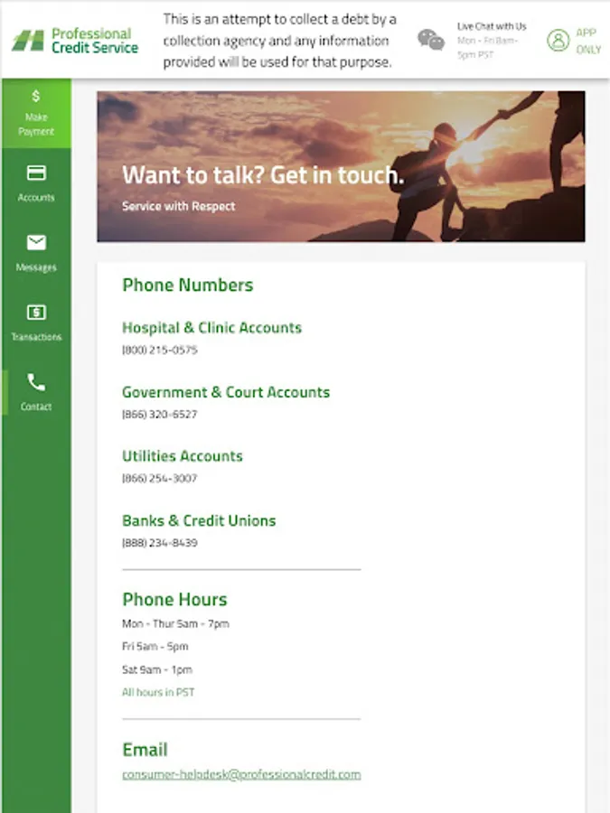 Both PCSDirectPay and Professional Credit Service follow the Fair Debt Collection Practices Act (FDCPA) which regulates the practices and activities of the collection of third-party accounts. We are members of ACA International, the Association of Credit and Collection Professionals. The association establishes ethical standards; produces a wide variety of products services and publications; and articulates the values of the credit and collection industry to businesses, policy makers and consumers.