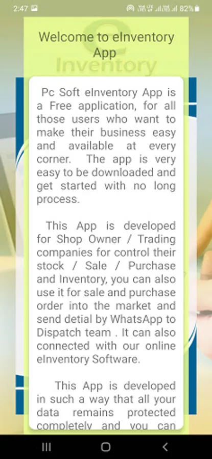 The app is very easy to be downloaded and get started with no long process.nn This App is developed for Shop Owner / Trading companies for control their stock / Sale / Purchase and Inventory, you can also use it for sale and purchase order into the market and send detail by WhatsApp to Dispatch team . It can also connected with our online eInventory Software.