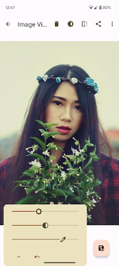 Adjusting brightness, contrast and saturation. View your gallery, set as wallpaper, flip and share with your friends!