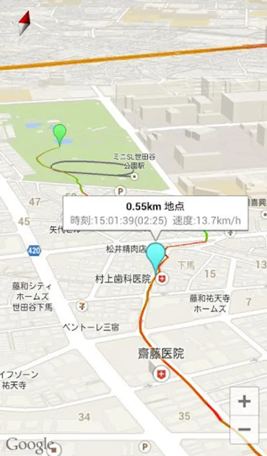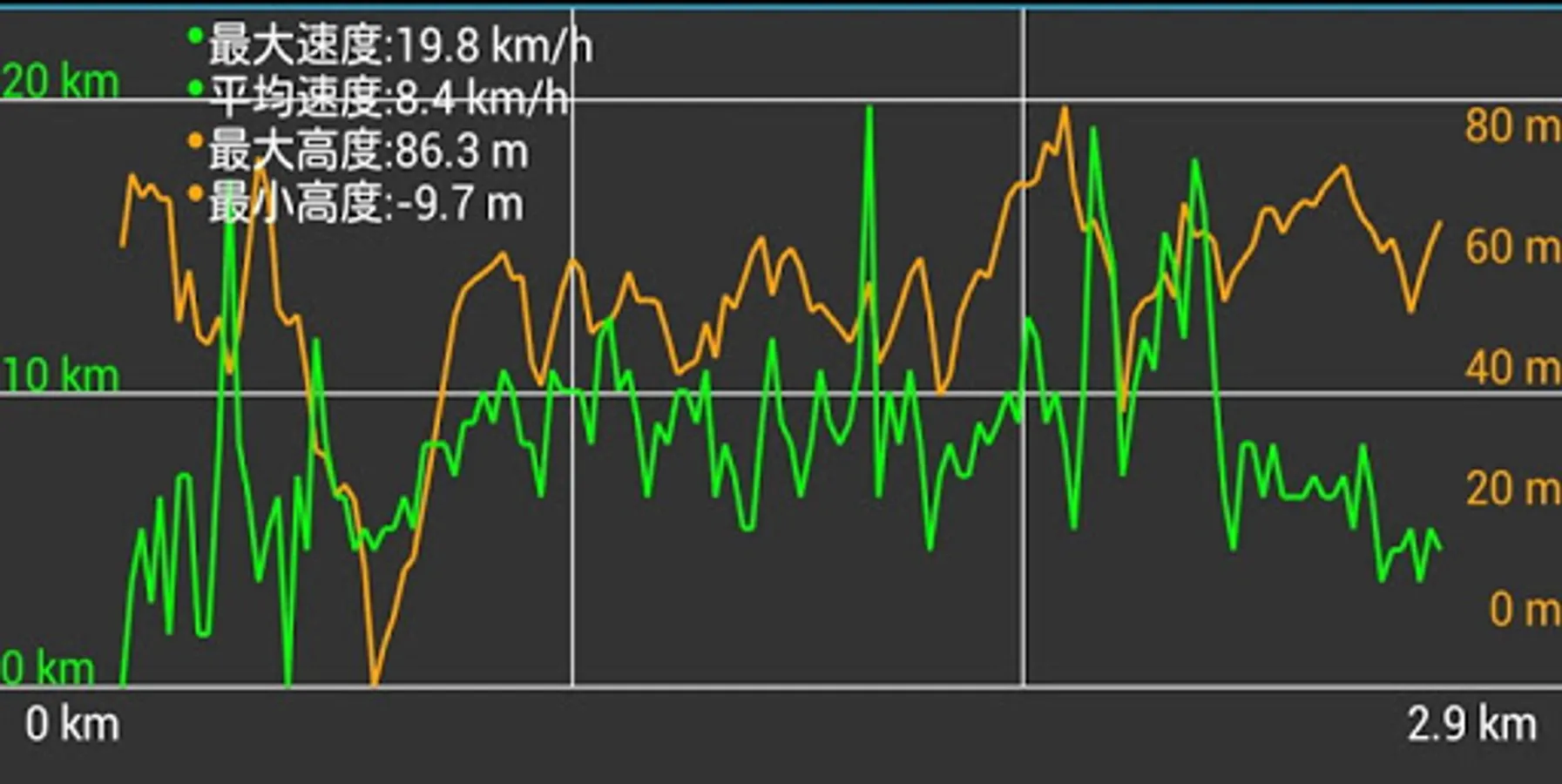 GPSを利用した経路記録では、各ポイントのスタート地点からの距離、時刻、タイム、速度を表示できます。また、経路はリアルタイムでも確認できます。その他、速度&高度グラフ機能、マップ上での速度別グラデーション表示機能(5番目の画像)もあります。
