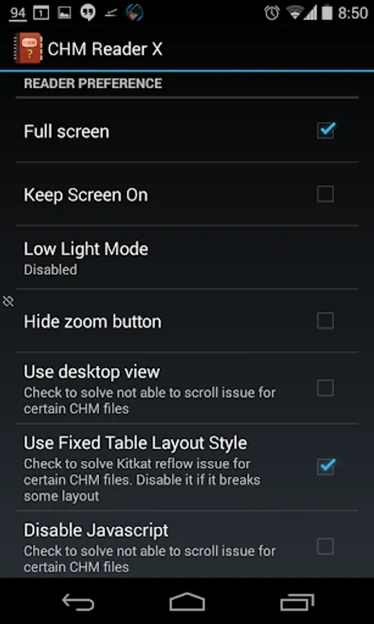 1. Reflow function is broken for some CHM file. So you may need to scroll left/right to view the pages. After latest upgrade 4.4.2, seems Google partially fixed this issue. So some of the file reflow works again, but not all.