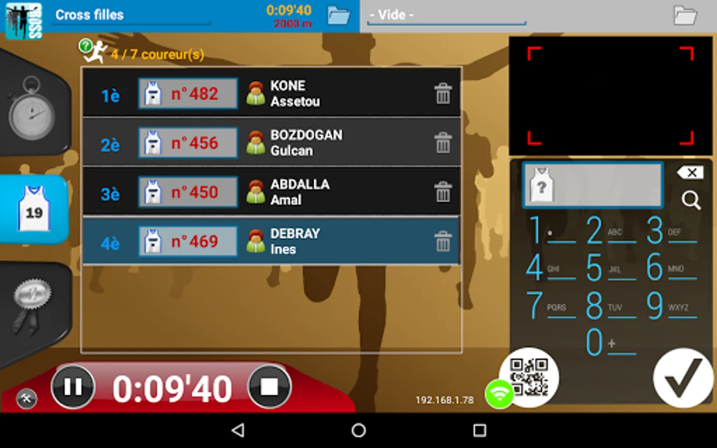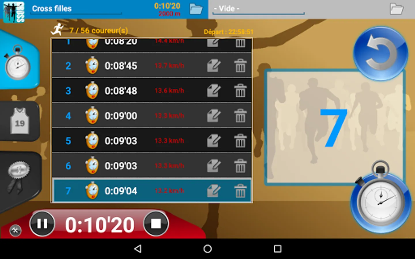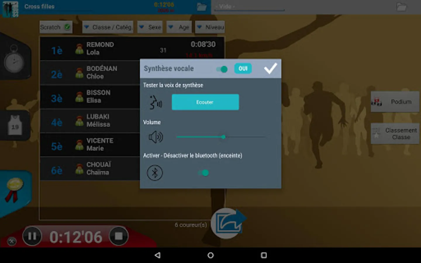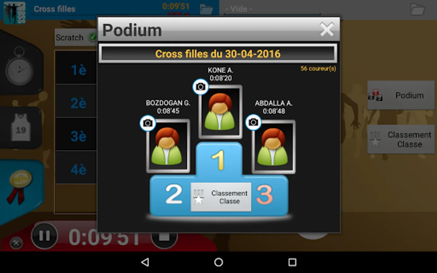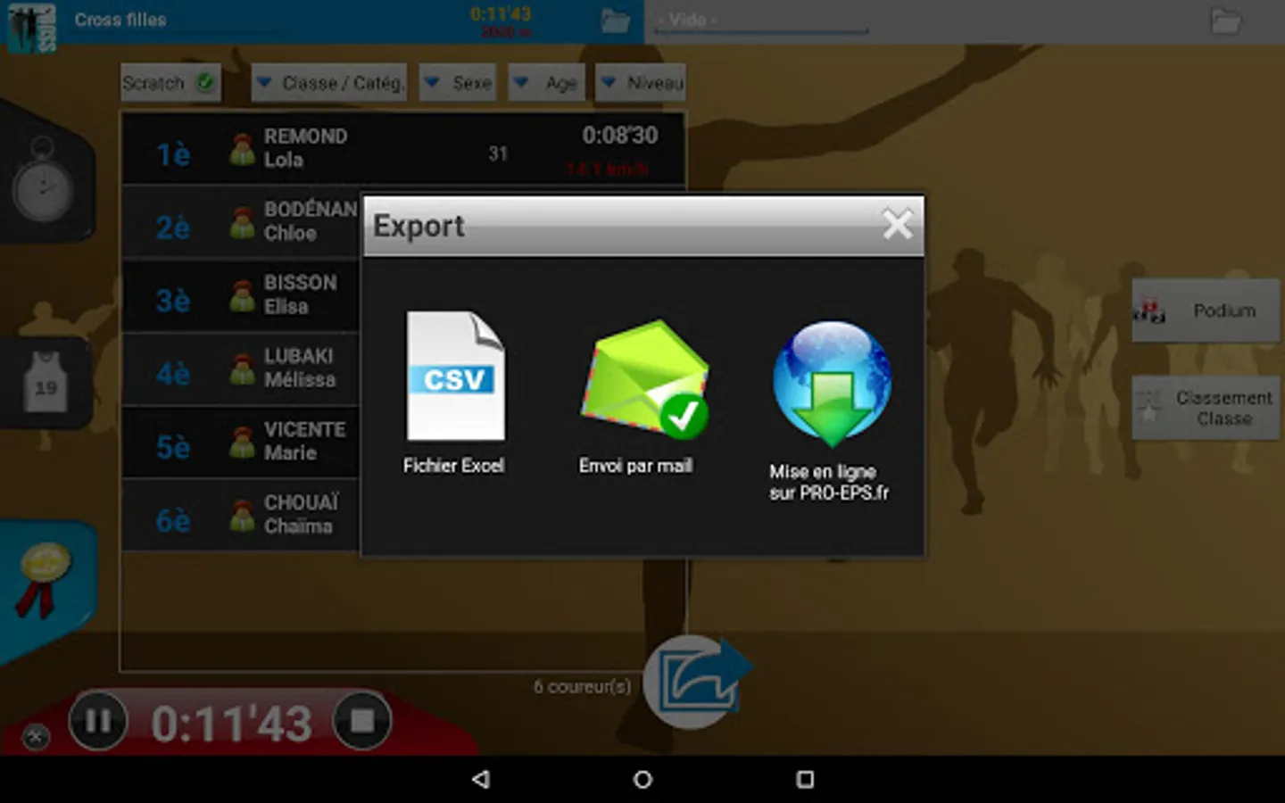 No need for a PC, one tablet is enough to manage all your errands: import, dossardage, timing, sorting runners in real time (by category, gender, age, class but also for school), speed management (for comparison with a VMA), everything is managed!