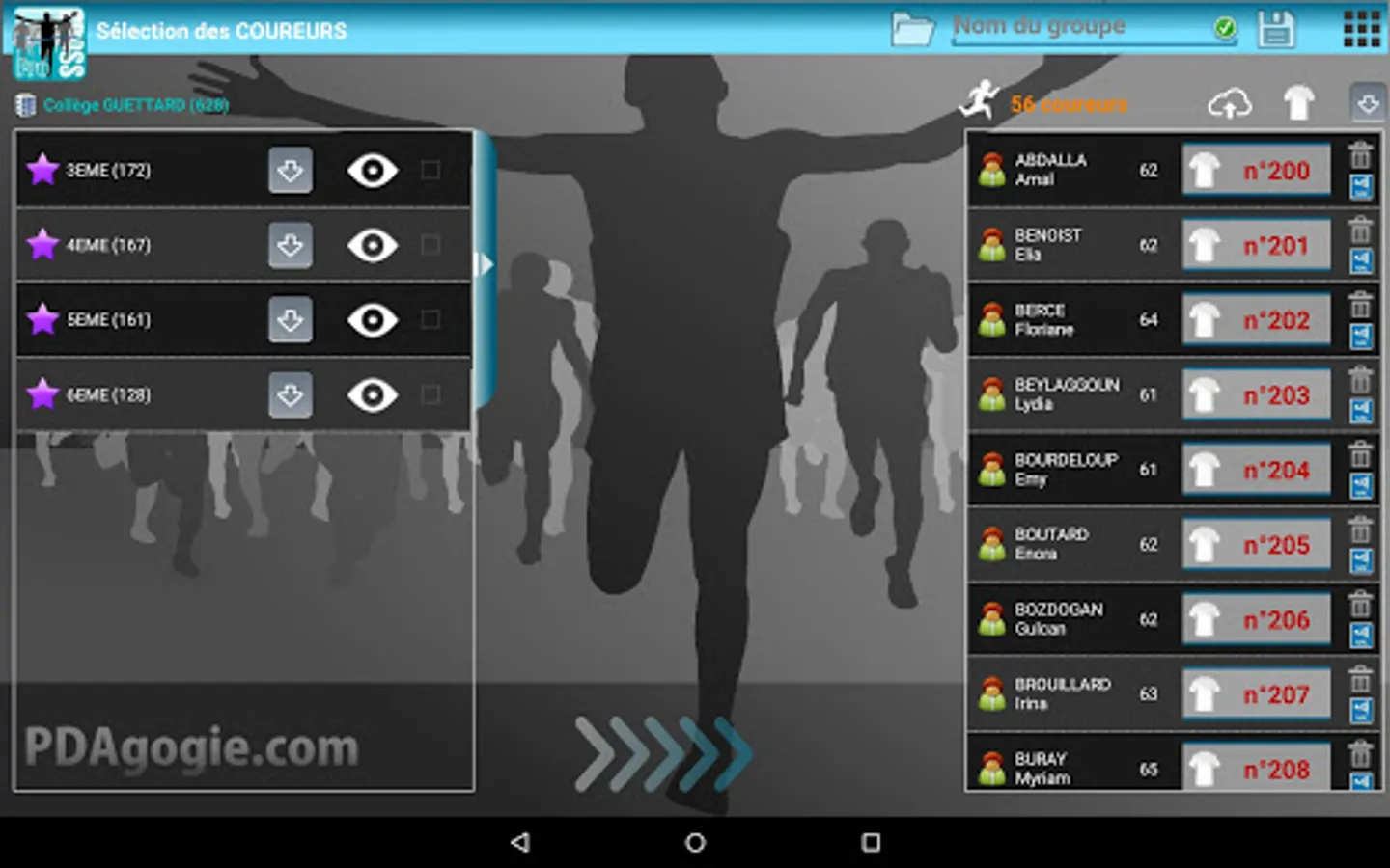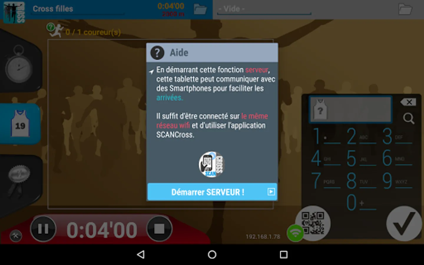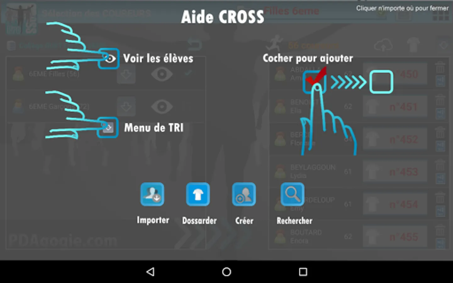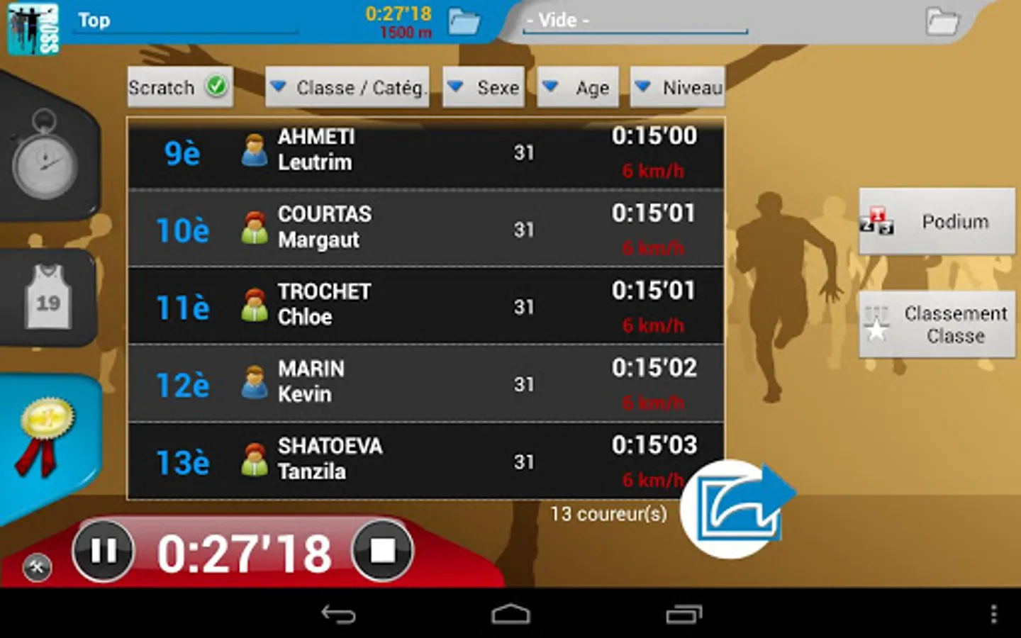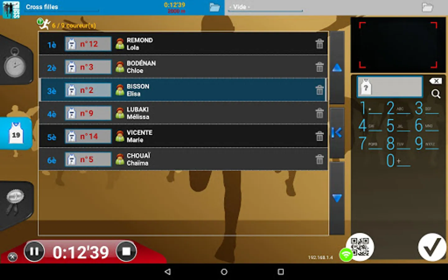No need for a PC, one tablet is enough to manage all your errands: import, dossardage, timing, sorting runners in real time (by category, gender, age, class but also for school), speed management (for comparison with a VMA), everything is managed!