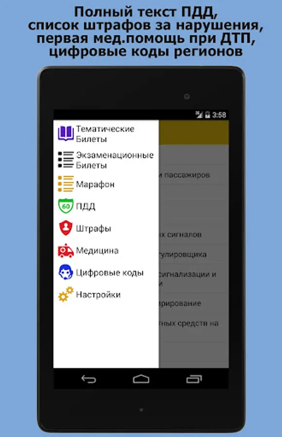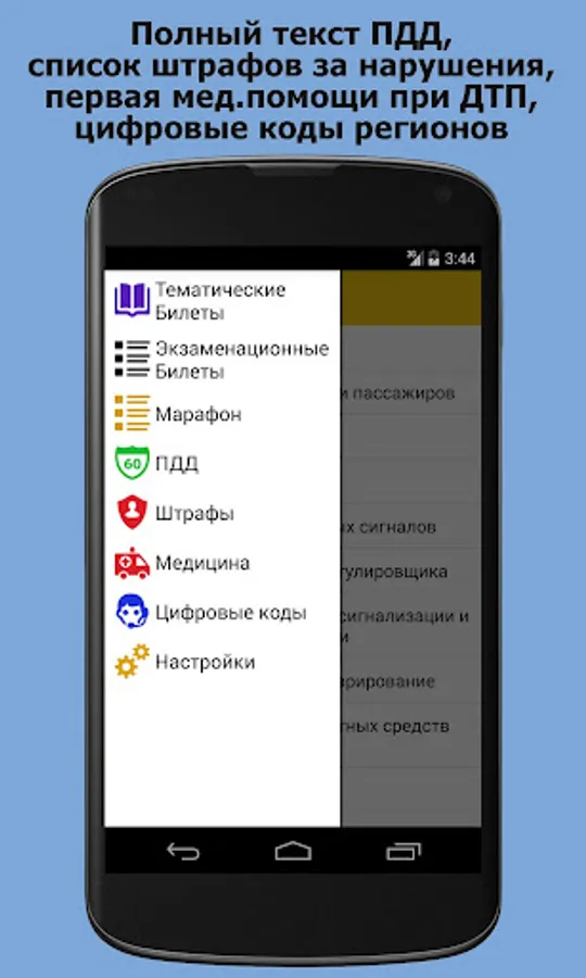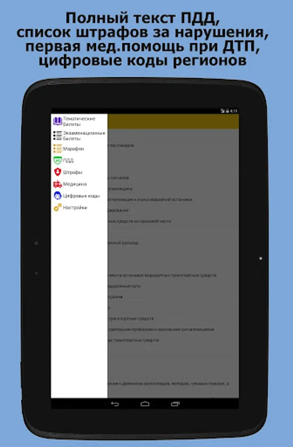 Application "on exam SDA traffic tickets - RF 2018 Thematic Tickets Examination tickets" to help you prepare to pass the test on traffic rules.
