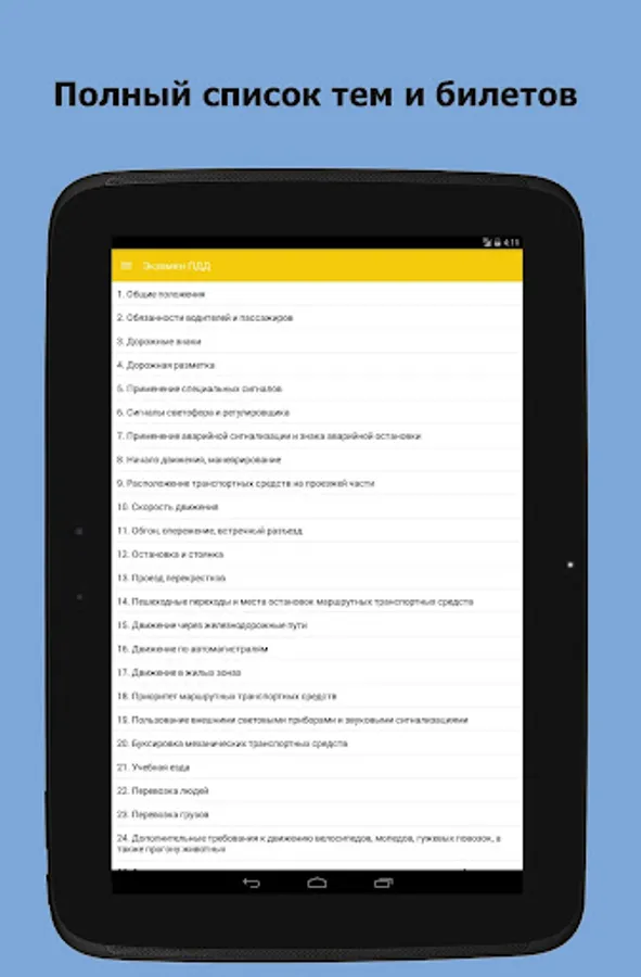 Application "on exam SDA traffic tickets - RF 2018 Thematic Tickets Examination tickets" consists of the following sections: