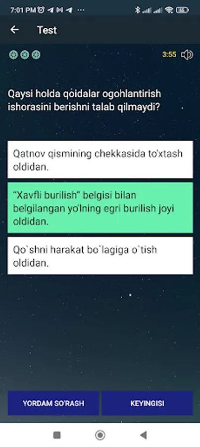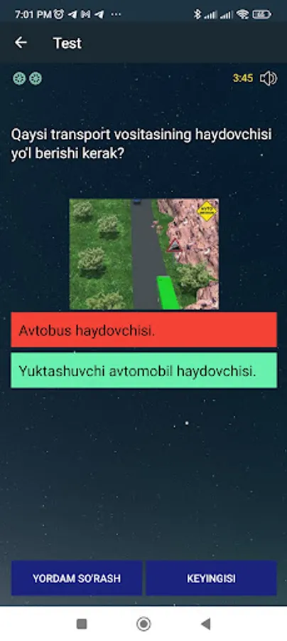 Yo‘l harakati qoidalari bo‘yicha viktorina ilovasini bugun yuklab oling, unga baho bering, sharh yozing va do‘stlaringiz va oilangiz bilan baham ko‘ring, ularga ham yo‘lda xavfsiz qolishlariga yordam bering!