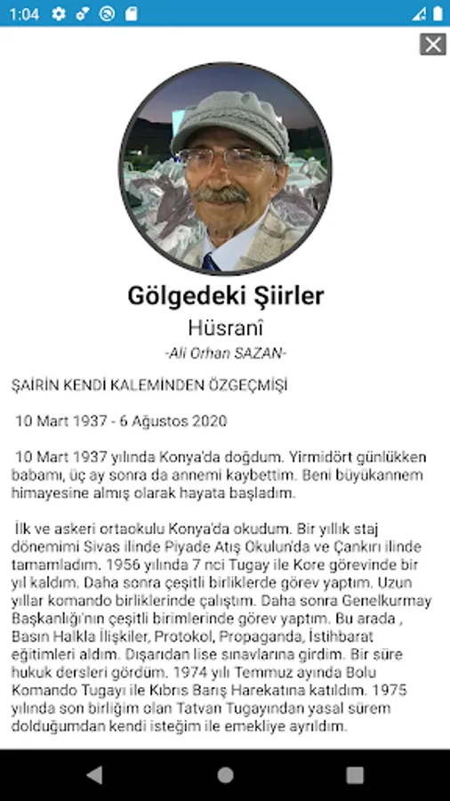 We present you a bunch of poems that our father Ali Orhan Sazan wrote and collected for years under the pseudonym Hüsranî. We aimed to introduce some of his poems, some of which he had the opportunity to publish locally during his lifetime, but could not convey to large audiences, to wider audiences as a tribute to his memory. We tried to make you hear the poems that he wrote since 1952, in which he conveys his feelings, thoughts, dreams and longings... In his poems, the truth of love, separation, reproach, disloyalty, being forgotten, being pushed but not forgetting smells here and there...