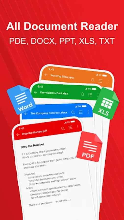 Free PDF Reader also helps you to read Excel files, read Word documents, and open PowerPoint. A PDF viewer is the best way of reading documents on your mobile phone. Open documents, read, share and delete, or rotate files with the PDF app free download. Install Simple All Document Reader Office App and read PDF, Docx, Word, PPT, Excel.