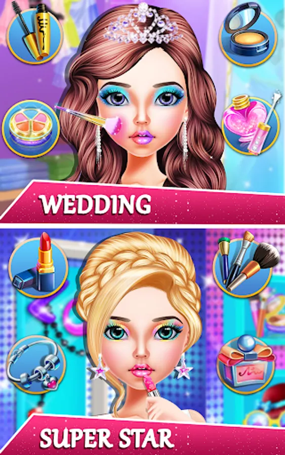 - Do wedding dress up, make-up with hairstyles, lips, cheeks, and more