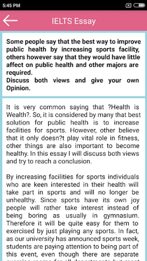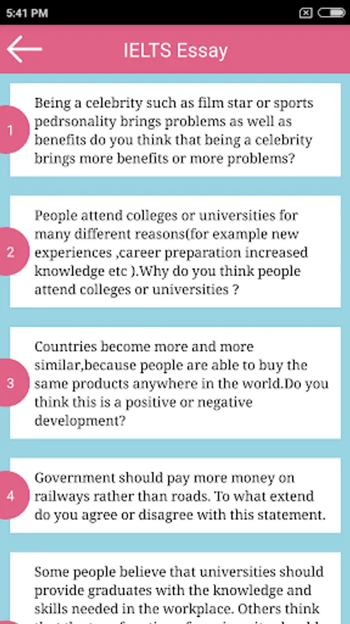 IELTS Essay app contains some sample IELTS essay questions and topics reported by IELTS students in writing task 2. The 200+ IELTS essay questions have been reworded and are organised under common topics which frequently come in IELTS writing task 2 - Academic.