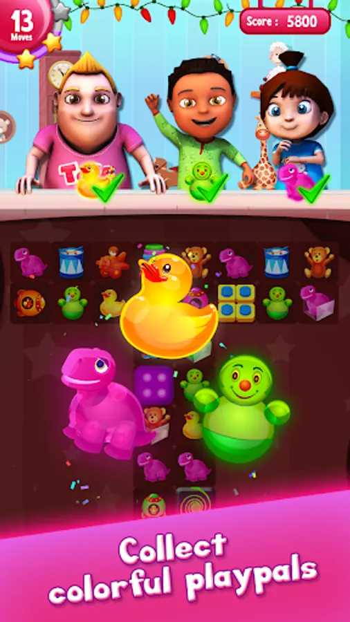 Match three or more toys of the same color to clear the level and collect the toys from the board.