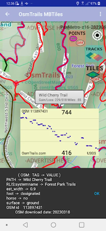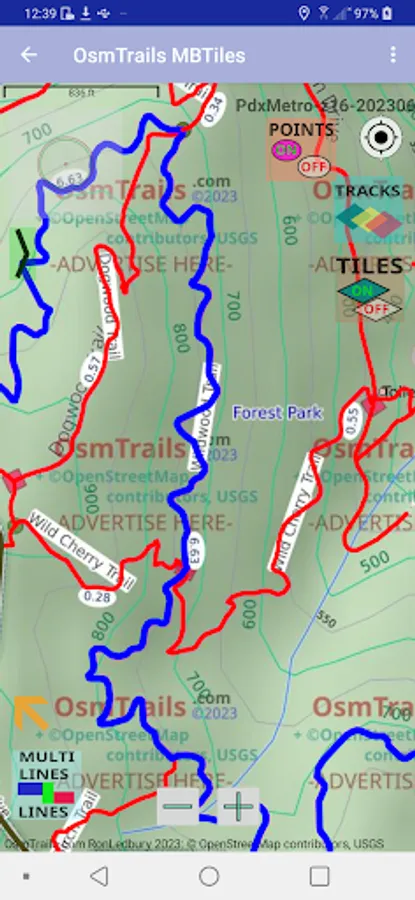 GPS Tracking, Forest Park Map. Can import MBTiles raster map that you select in your Download folder. Can import what I call Profiles files that are path and bicycle tagged extracts from OpenStreetMap data that can be displayed on MAP.