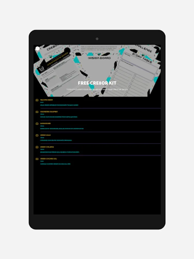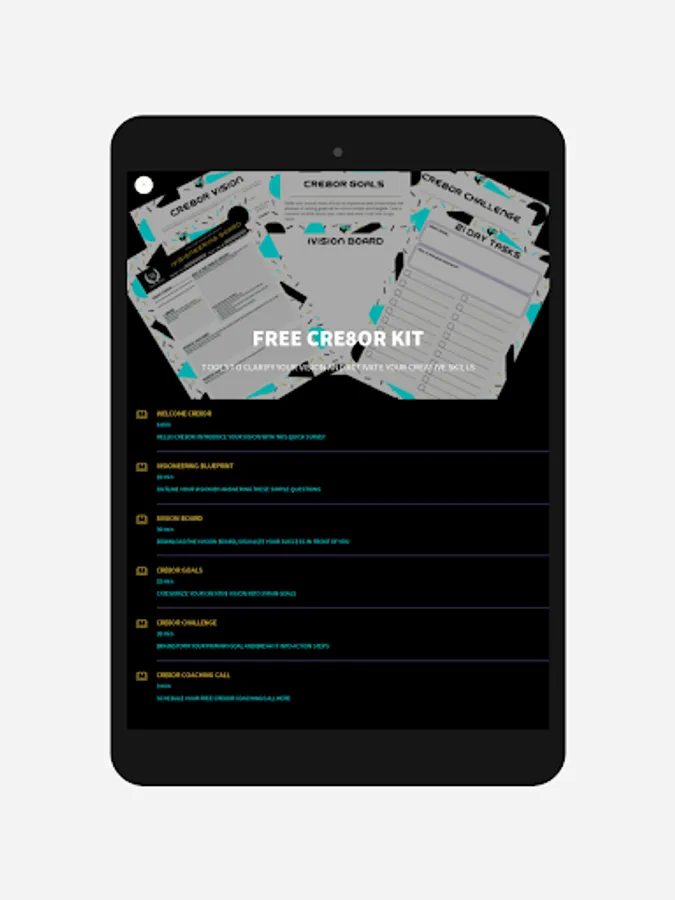 INSTANTLY GET A FREE 'CRE8OR KIT' WITH EVERYTHING YOU NEED TO CLARIFY YOUR VISION AND UNLOCK YOUR GENIUS.