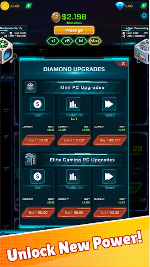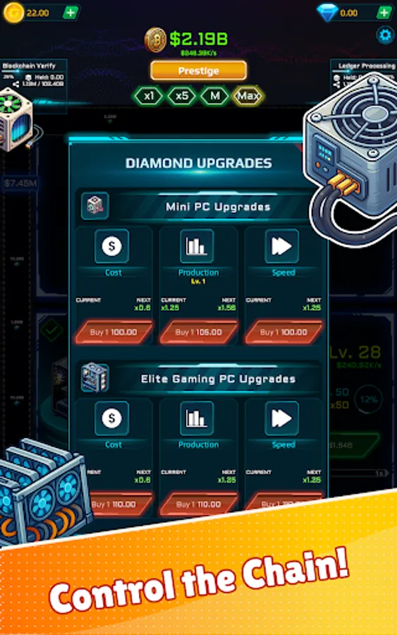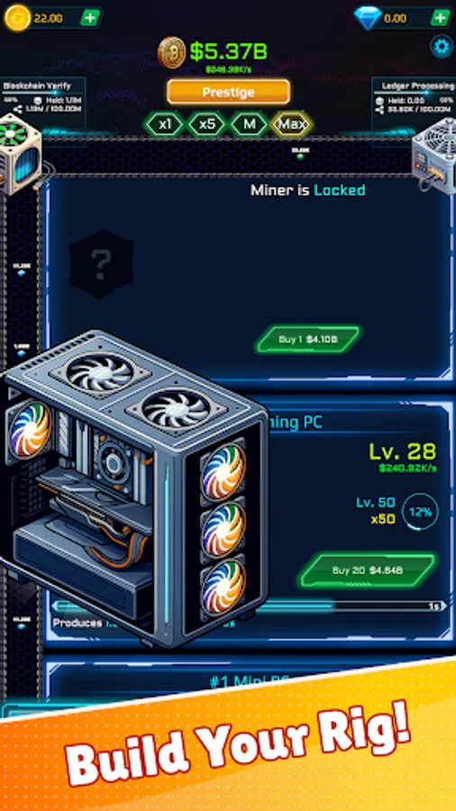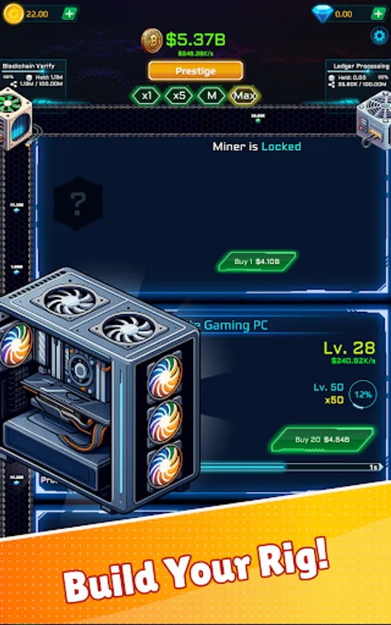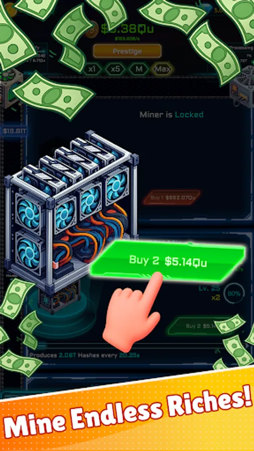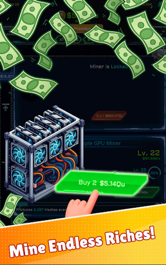 Level up rigs, unlock powerful upgrades, and stack global modifiers to skyrocket income. Tackle rotating tasks for bonus rewards and push further with prestige resets for permanent boosts. Whether you play for minutes or hours, robust offline earnings keep progress rolling while you’re away.