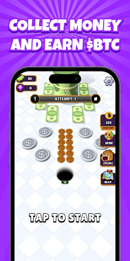 Welcome to the world of Bitcoin Hole! Take control of a devious hole embarking on a grand mission to orchestrate the ultimate heist. In this captivating arcade-style game, your objective is clear: maneuver the hole through intricate levels, collecting a myriad of valuable treasures scattered in cunning arrangements. With a ticking timer adding to the thrill, you must exhibit swift maneuvers and strategic finesse to amass all the valuables before time elapses.