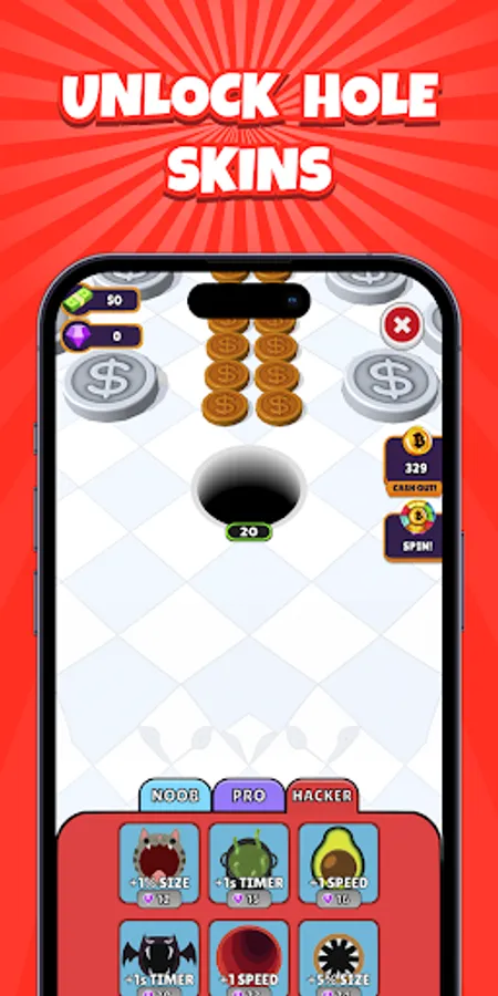 To elevate your hole's capabilities and unlock its full potential as a mastermind of thievery, Bitcoin Hole presents an array of enhancements available for acquisition. With each triumphant escapade, your gains flourish, granting you access to a wider selection of upgrades. Carefully elect from alternatives like extended time, an expanded hole, or heightened hole velocity to tailor your gameplay encounter.