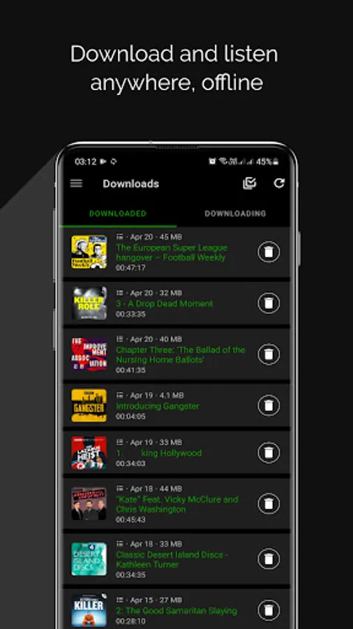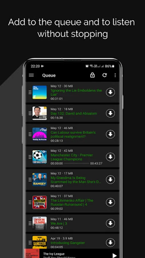 - Filter and sort by alphabetically, date, duration, the title of episode or podcast, or randomly