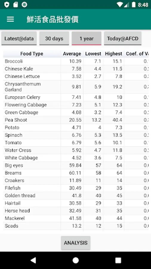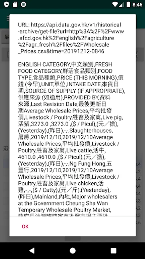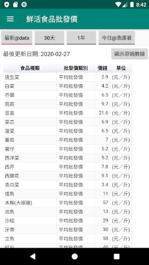 - 顯示由香港漁農自然護理署在「資料一線通」(data.gov.hk)發放「主要鮮活食品參考平均批發價」的最新資料。