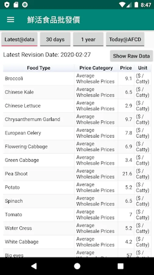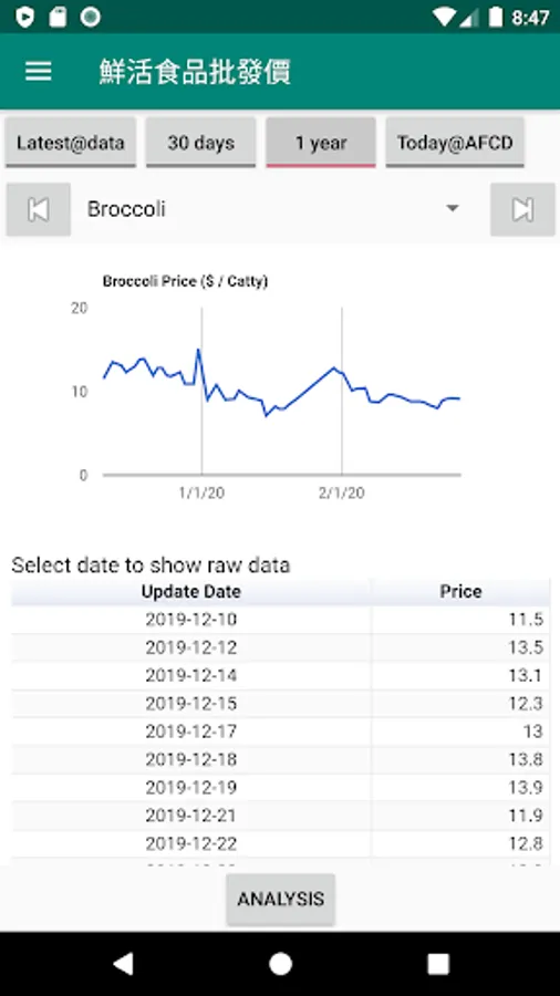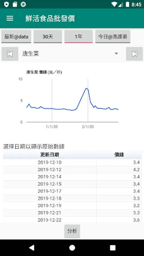 - 用圖表顯示各食品的價錢在過去30天和一年的變動。