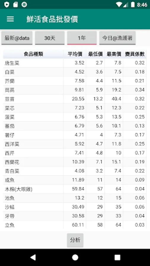 - 分析各種食物的最高、最低、平均價及變異係數 (Coefficient of Variation)