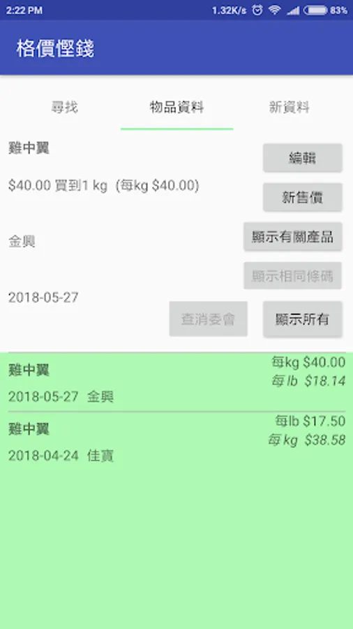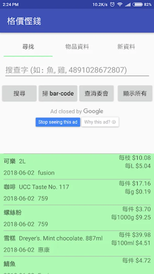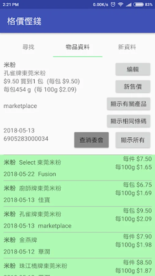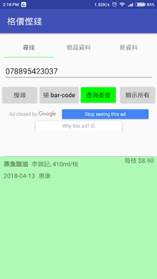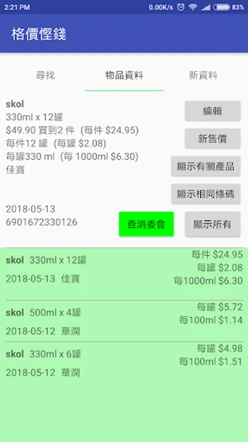 如想在'格價慳錢' App 中搜尋曾輸入的貨品,除以關鍵字外,也可以用「掃bar code」功能,準確查出相同條碼的已存資料。