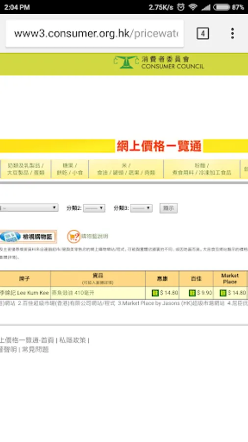 此外,'格價慳錢' App 設有「掃bar code」功能,只要用手機影貨品上的條碼就能自動辦認 條碼號碼並搜尋紀錄, 再按「查消委會」按鈕便會打開瀏覽器,即時查看消費者委員會「網上格價一覽通」的網上資料。
