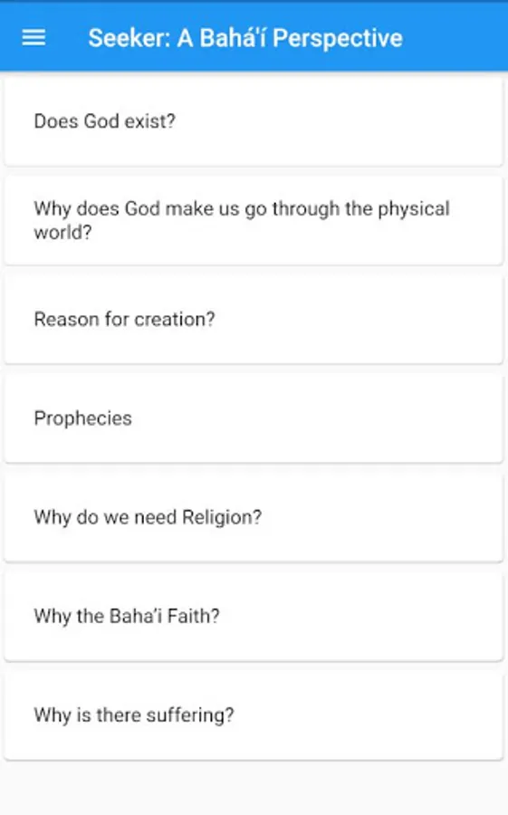 Seeker offers answers to some of life's difficult questions through the perspective of a Baha’i using the Baha’i writings. Questions answered include topics like "Does God exist?", "Reason for Creation?", "Why do we need religion?", Why does God make us go through the physical world?", and "Why is there suffering?"