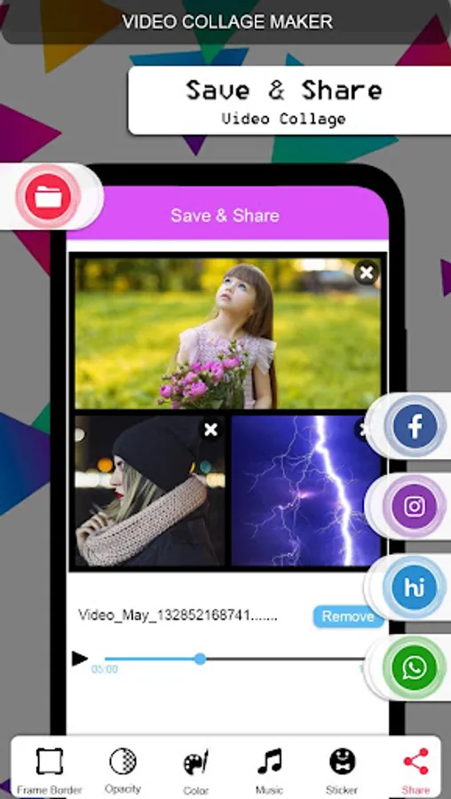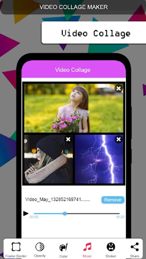 Video collage Maker takes as you like various video clips and music and makes video collage. Never miss happy moments of life now and share them through video collage, completely free and simple to use.