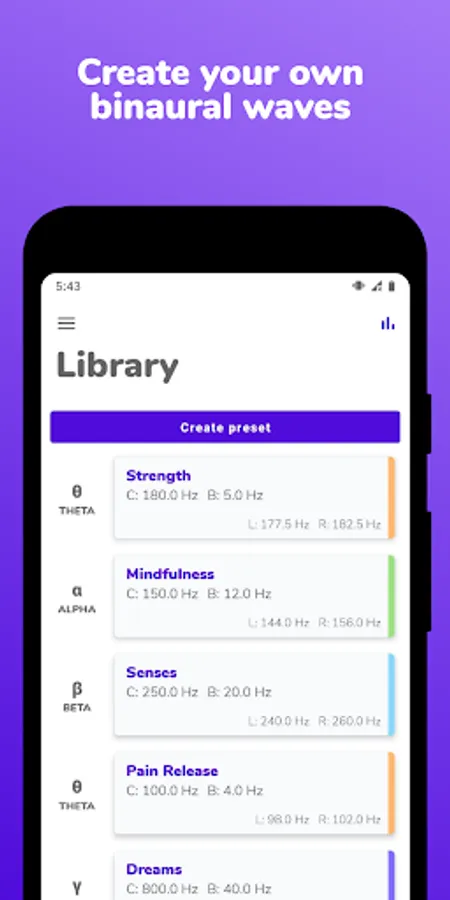 Create your own presets and save them in the library with the binaural beat generator. You just need to swipe to the left to erase them.