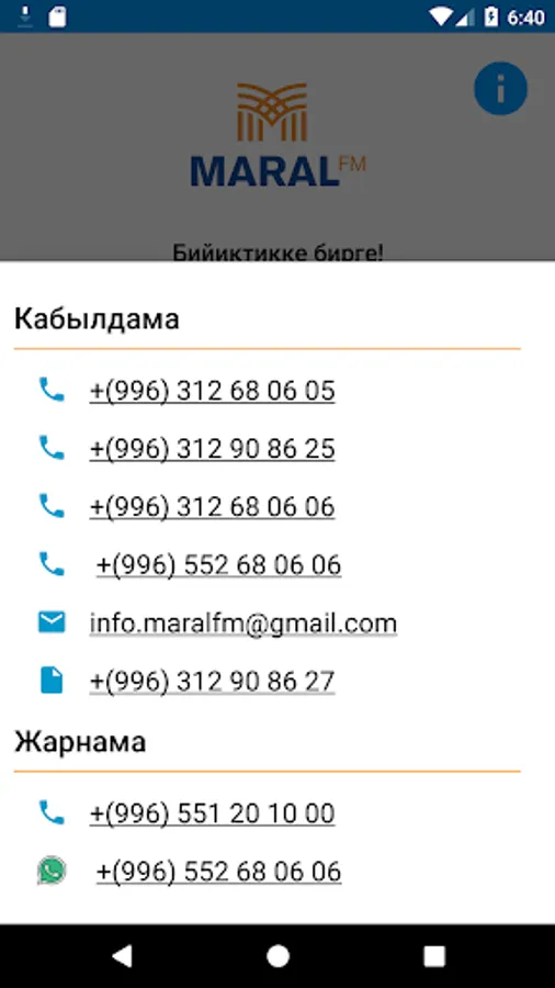 Bul - "Maral" radiosunun rasmiy tirkemesi. Ukturuulary tүz etherde audio broadcast arkyluu ugup, kyzykkan surooloruңuz bolso, tirkeme arkyluu tүz etherge baylanysha alasyz. Oshondoy ele, shilteme menen bizdin socialdyk tarmaktarybyzga zhana www.maralfm.kg sites on kirip, akyrky maalymattar menen taanyshykyz.