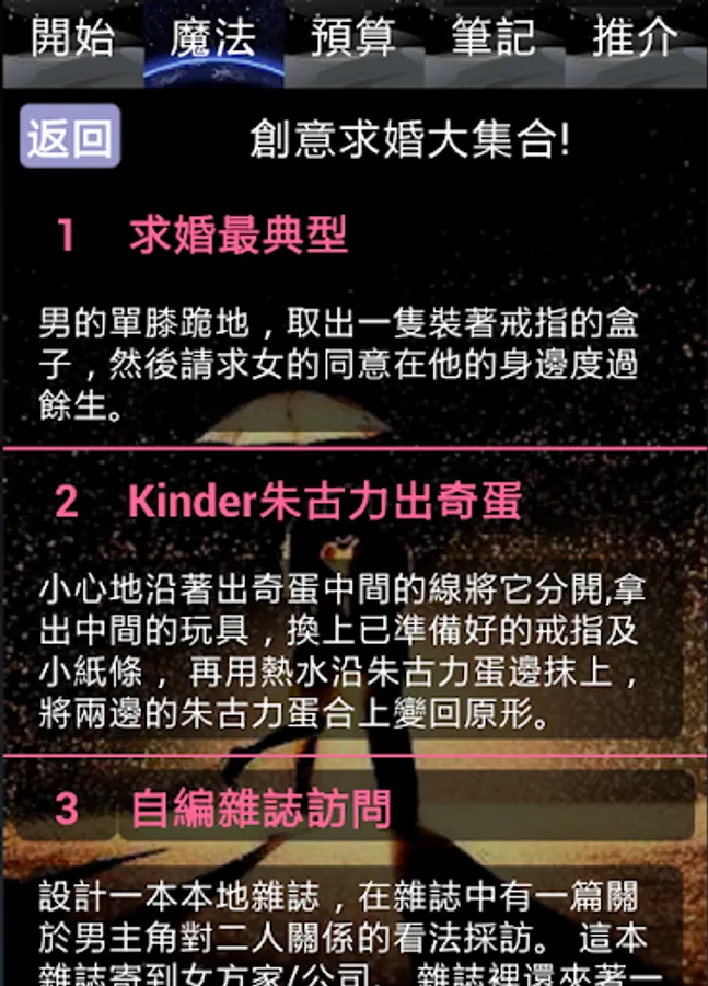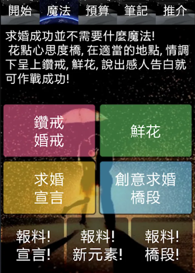 The apps includes many creative proposal methods and touching wordings as well as information regarding how to evaluate diamond rings and meanings of flowers.