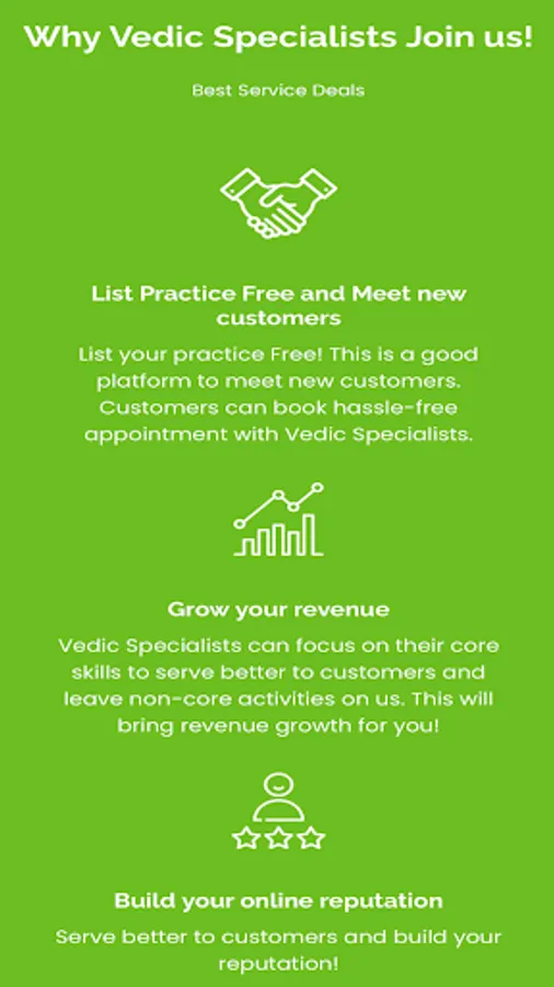 Vedic Specialists like Astrologers, Vastu Consultants, Pujari, Numerologist, Tarot Card Readers, Palmist etc. are welcome to join us and list their business or practice free on BookingAstro.