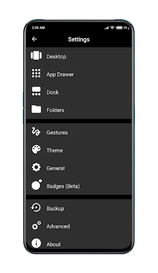 • Drawer Customisations Card background grid size, sort mode(alphabetical or install time), show search bar, predicted apps, accent color ,direct scroll , Pull dock to open and much more.