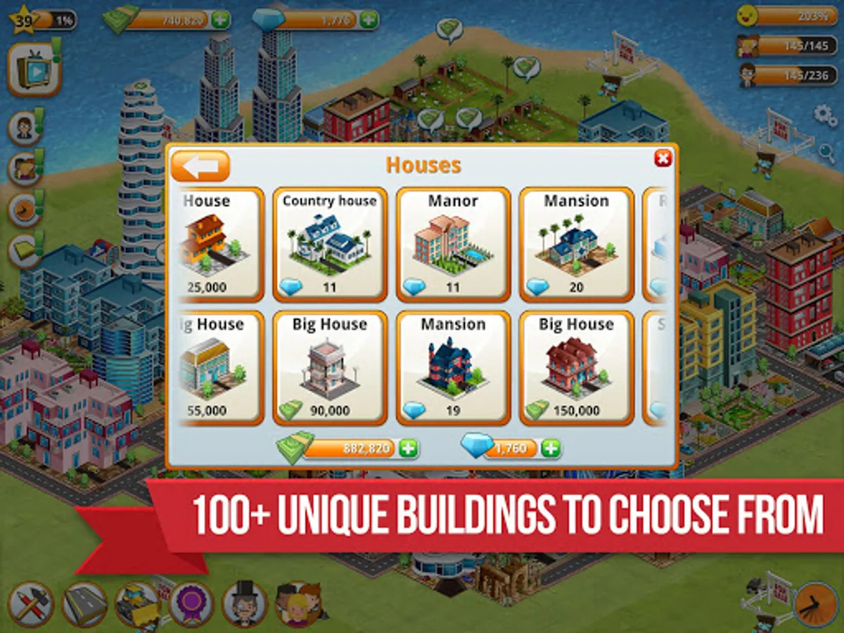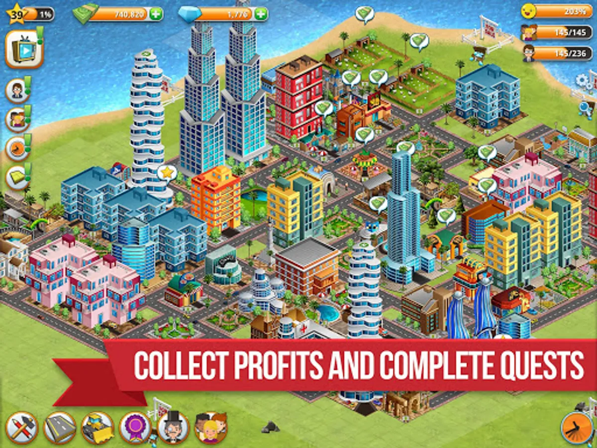 Discover, be creative and expand your island, town and beach life in a virtual world full of quests where you have the power to build a lot of different structures with a choice of 100+ unique buildings, like hotels, cinema's, offices, bakeries, restaurants, and even oil platforms on your island paradise. Start with a tiny village and grow it into a large metropolis. Catch some fish with your boats, make people happy by building parks, beach huts, schools, churches, libraries, museums, plants, and even a nice ferris wheel. It is all about insight and balance in this village city town game: happy people attract more citizens, who will need residences and jobs. You have all the power in this epic story: discover what is the best way to be a successful entrepreneur in this fabulous virtual world!