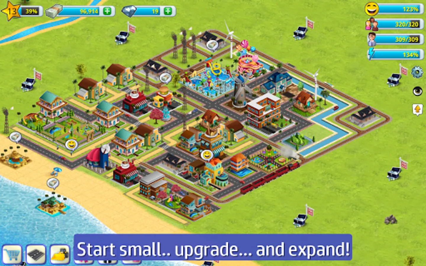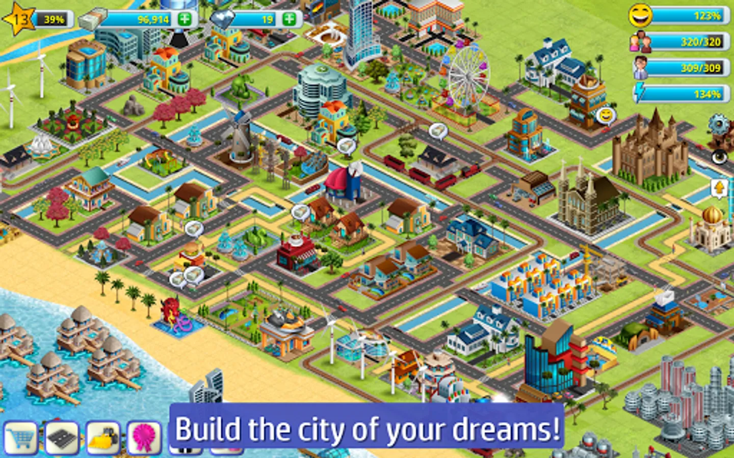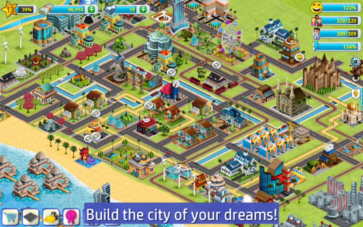 Discover and expand your island, town and beach life in a virtual world full of quests where you have the power to build a lot of different structures with a choice of 100+ unique buildings, like hotels, cinema's, offices, bakeries, restaurants, and even oil platforms on your city island. Start with a tiny city and grow it into a large metropolis. Catch some fish with your boats, make people happy by building parks, beach huts, schools, churches, libraries, museums, plants, and even a nice ferris wheel. It is all about insight and balance in this city town game: happy people attract more citizens, who will need residences and jobs. You have all the power in this epic story: discover what is the best way to be a successful entrepreneur in this fabulous virtual world!