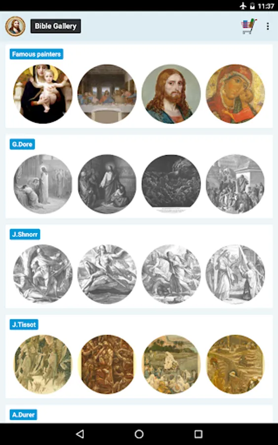 Bible Gallery is a large collection of biblical paintings, prints and drawings. Famous artists' masterpieces open the world of God's word and help to enrich your knowledge in Bible study. Our app expands your horizons an it is a great addition to Bible reading.