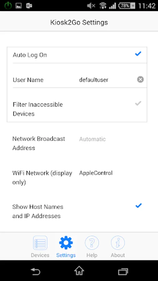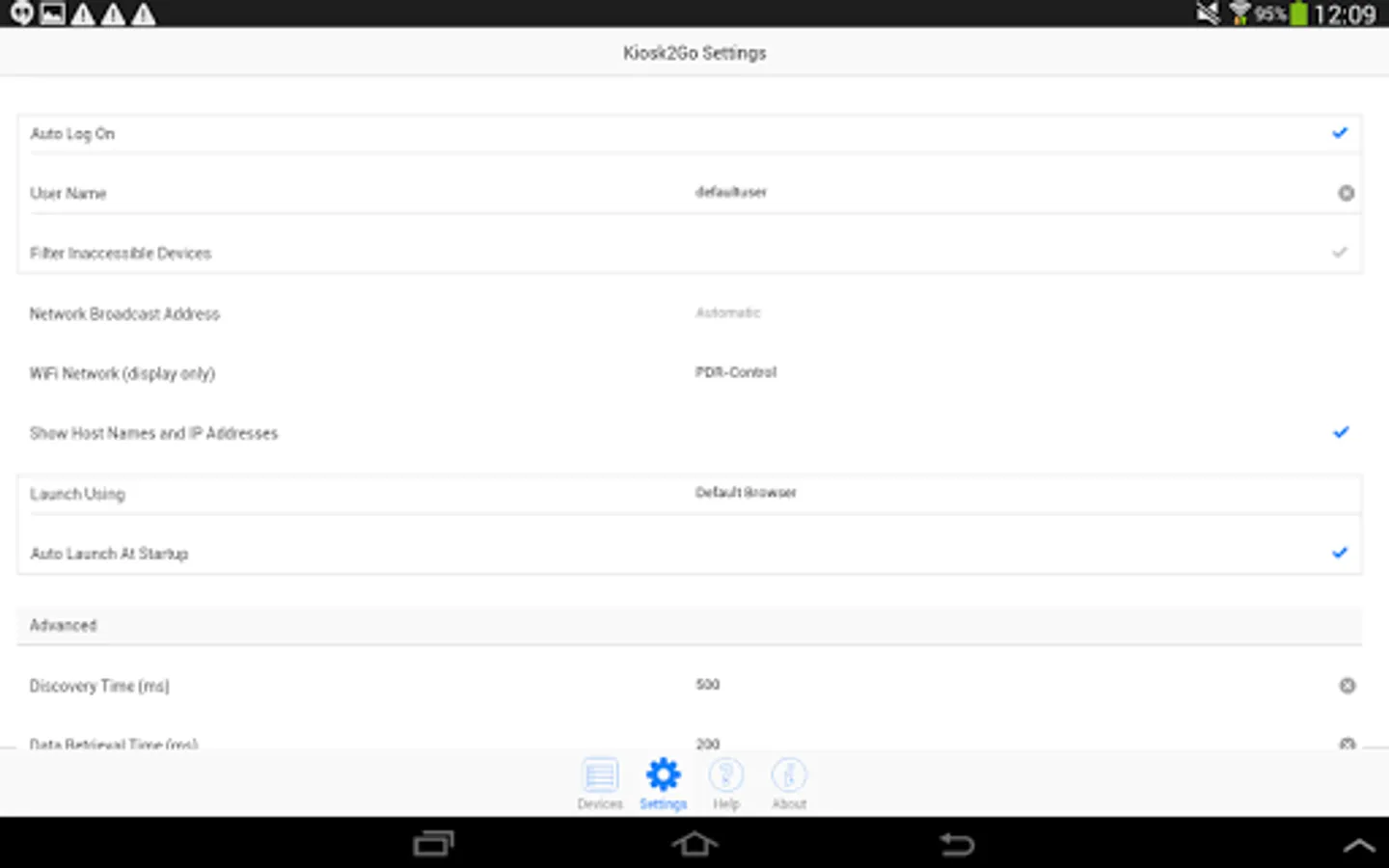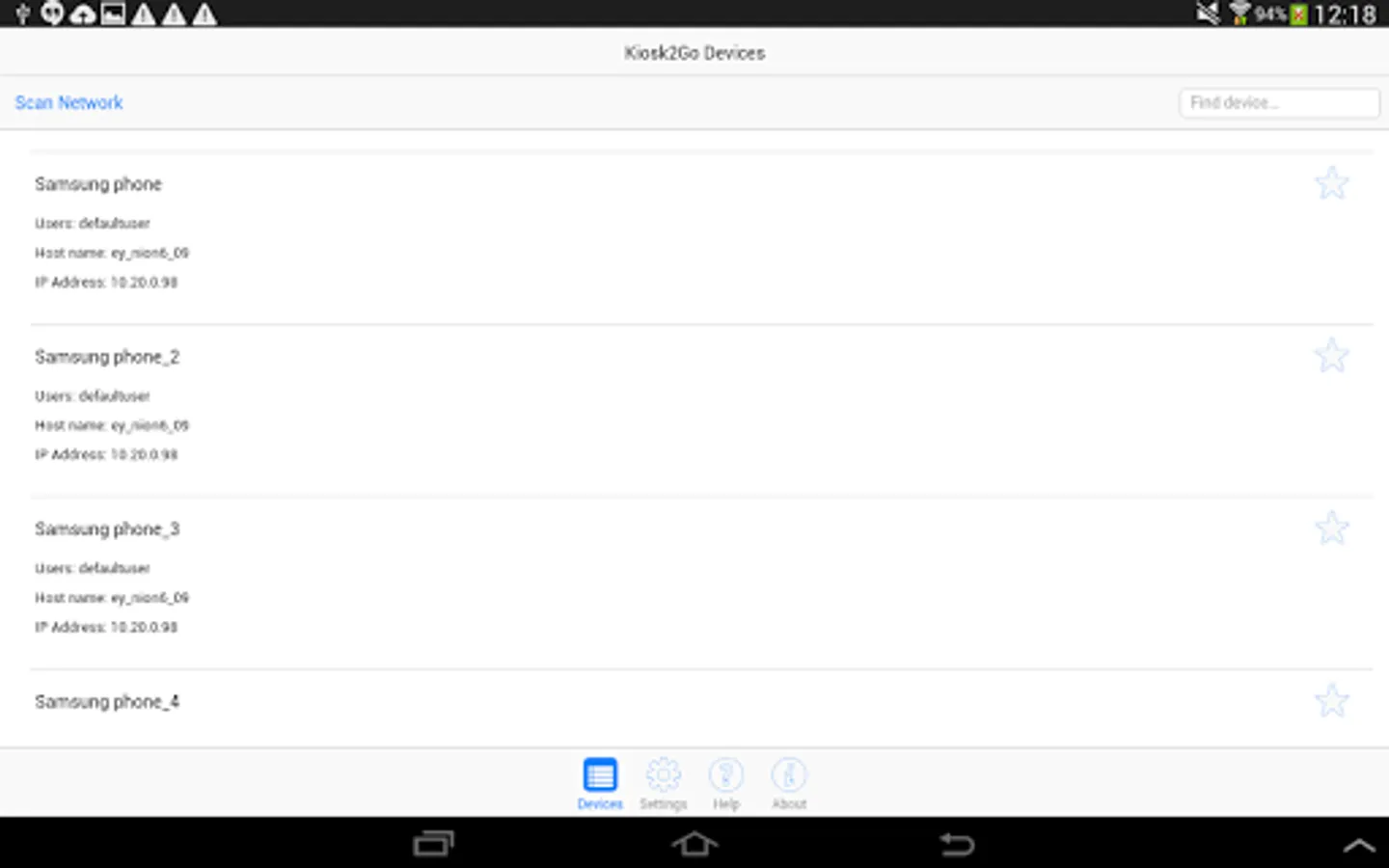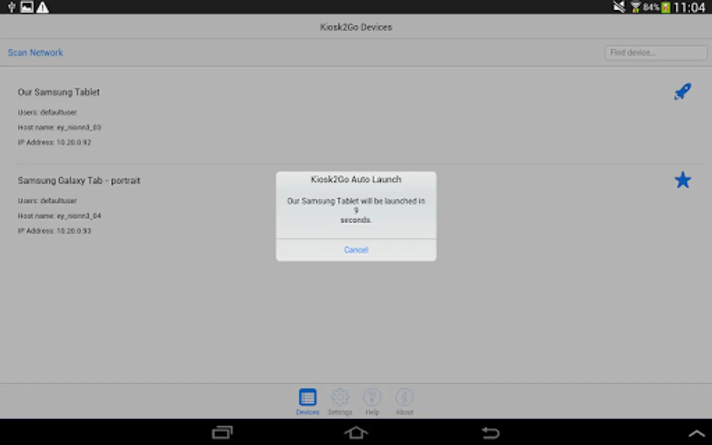 This application scans the network for MediaMatrix nodes running Kiosk2Go, and presents a list of all the Kiosk2Go devices. You can tap a device to connect to Kiosk2Go full screen or in the default browser. If no browser has been set as the default, you will be presented with a list of available browsers to use.