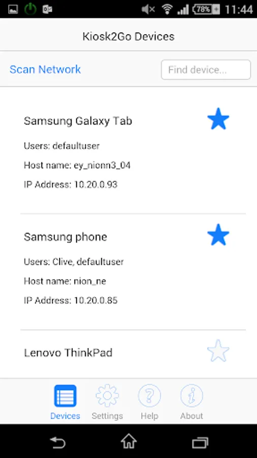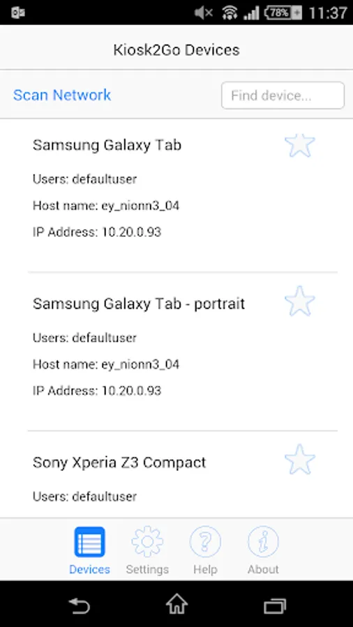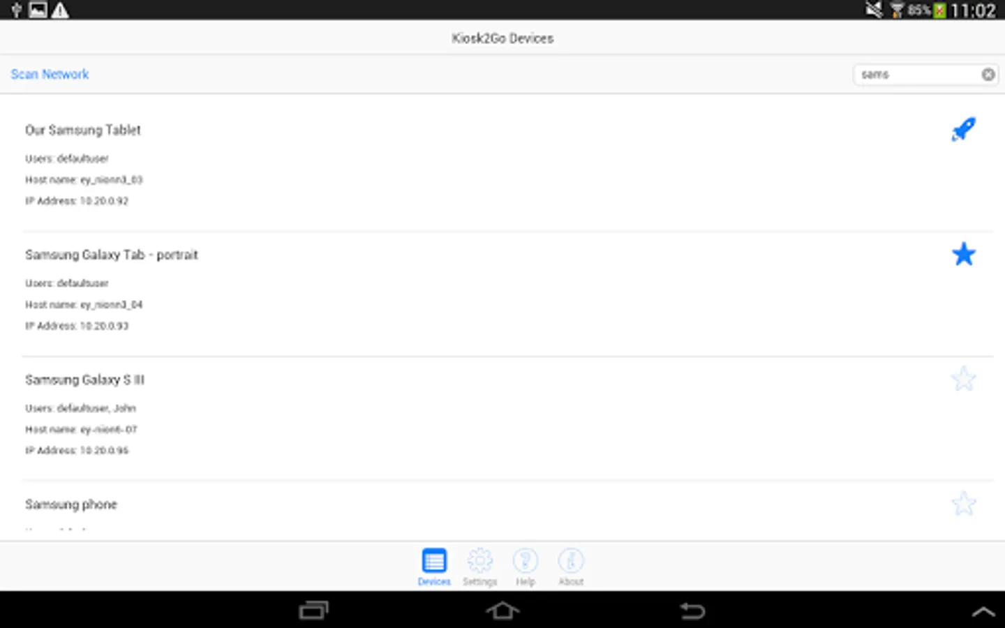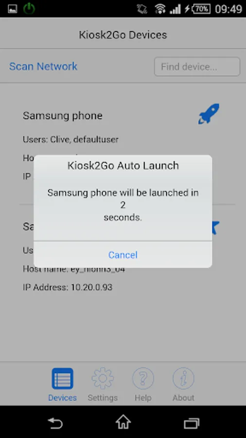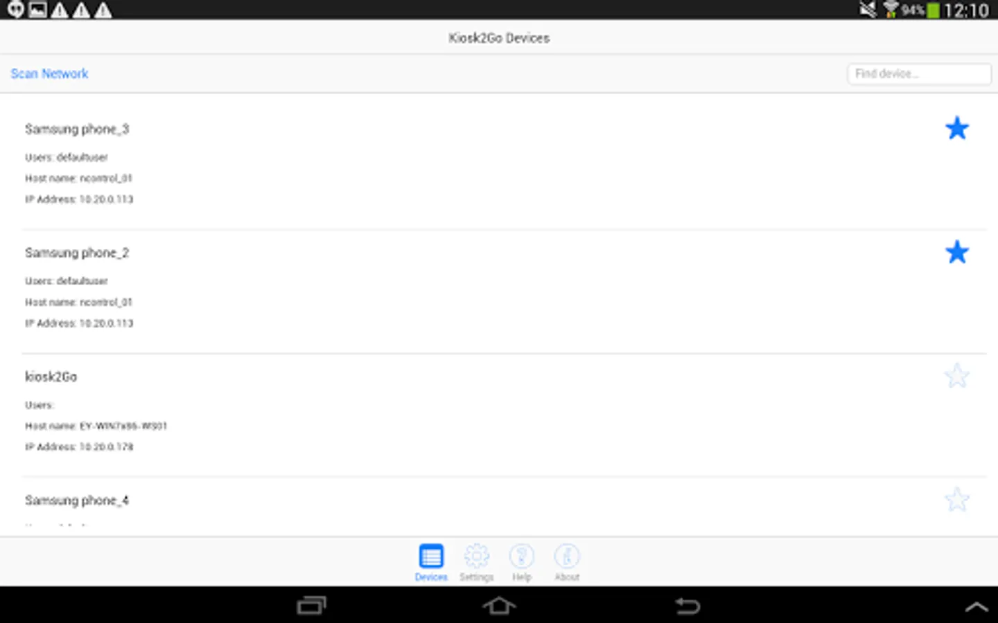 This application scans the network for MediaMatrix nodes running Kiosk2Go, and presents a list of all the Kiosk2Go devices. You can tap a device to connect to Kiosk2Go full screen or in the default browser. If no browser has been set as the default, you will be presented with a list of available browsers to use.