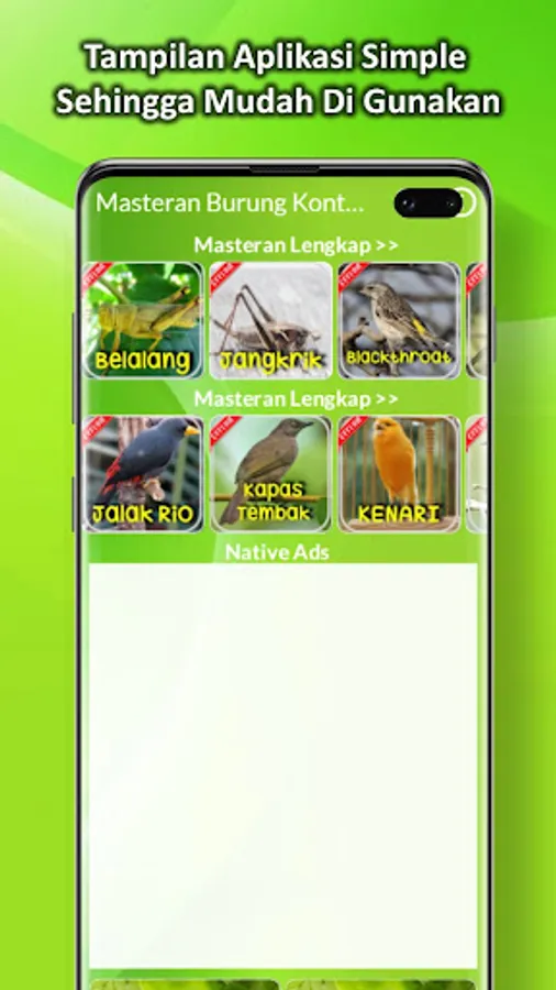 The Masteran Burung Contest application is a collection of several special and most popular bird audios used as masters (vocal teachers) for fighter-type birds such as kacer, stone magpie, green cucak and others. This application runs on an offline system, so without data quota it can still be played. By downloading and playing this audio on a regular basis to your bird, it is hoped that it will be embedded in its memory which will then add variety to its chirping and become shooting material when it is contested.