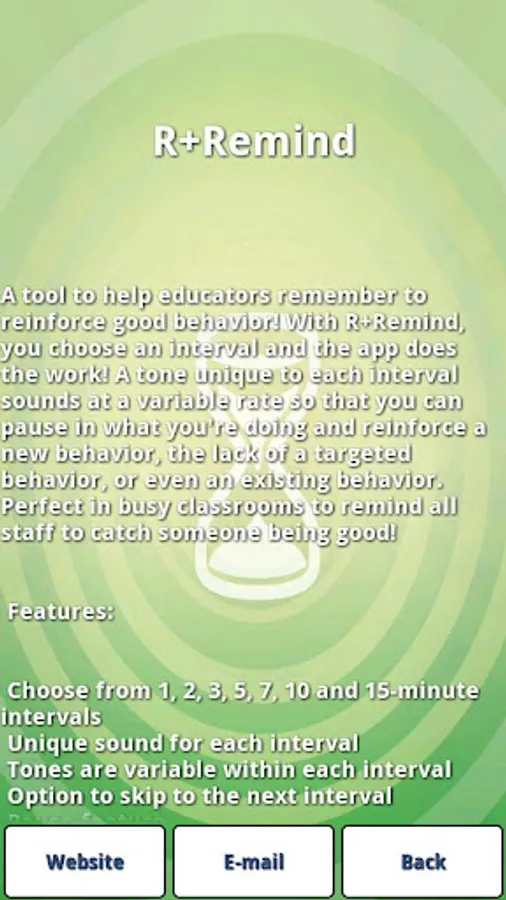 A tool to help educators remember to reinforce good behavior! With R+Remind, you choose an interval and the app does the work! A tone unique to each interval sounds at a variable rate so that you can pause in what you're doing and reinforce a new behavior, the lack of a targeted behavior, or even an existing behavior. Perfect in busy classrooms to remind all staff to catch someone being good!
