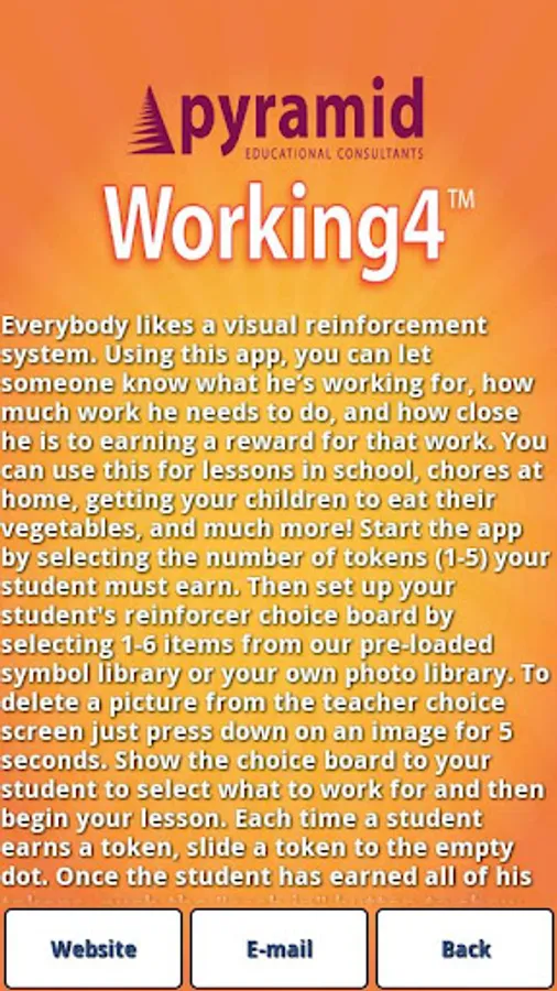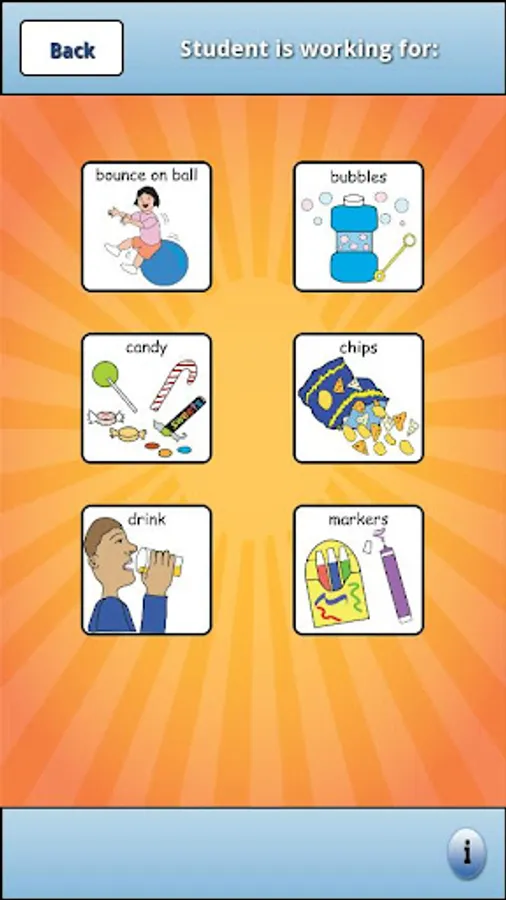Everybody likes a visual reinforcement system. Using this app, you can let someone know what he’s working for, how much work he needs to do, and how close he is to earning a reward for that work. You can use this for lessons in school, chores at home, getting your children to eat their vegetables, and much more! Start the app by selecting the number of tokens (1-5) your student must earn. Then set up your student's reinforcer choice board by selecting 1-6 items from our pre-loaded symbol library or your own photo library. To delete a picture from the teacher choice screen just press down on an image for 5 seconds. Show the choice board to your student to select what to work for and then begin your lesson. Each time a student earns a token, slide a token to the empty dot. Once the student has earned all of his tokens, push the "cash in" button to show your student what he's earned! The token board resets to start the next deal or you can create a new choice board for your student to select a new reinforcer.