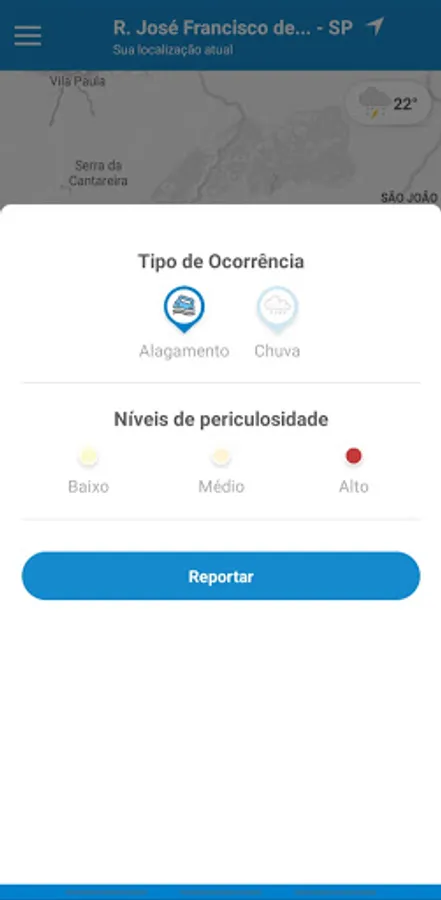 To report an occurrence the user will need to log in to the application. The user can report from a flood probability alert area by clicking the "report" button within the modal, or from the report map, clicking the "Report an occurrence" button; When clicking on the button, a screen will be opened, for the user to select which type of occurrence he wants to report (Flood or rain), then select one of the three levels and click on report.
