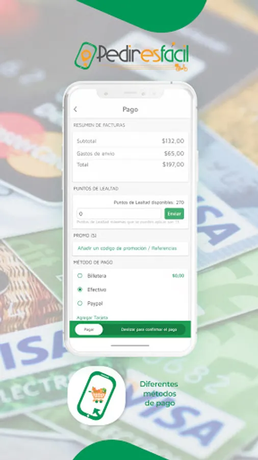 Podrás realizar pagos en efectivo o con tarjeta de crédito/débito y una vez realizado tu pedido, podrás saber exactamente el estado en el que se encuentra, así como, la ubicación en tiempo real del repartidor asignado a tu pedido.